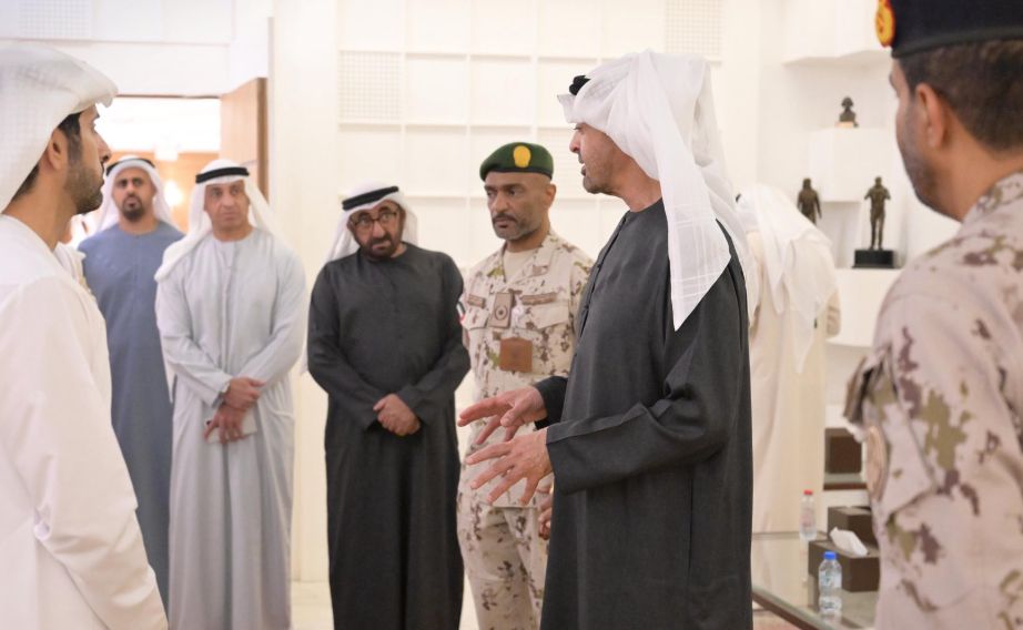 وبحسب بيان للوزارة رافق رئيس الدولة خلال الزيارة كل من: الشيخ حمدان بن محمد بن راشد آل مكتوم، ولي عهد دبي نائب رئيس مجلس الوزارء، وزير الدفاع، الشيخ هزاع بن زايد آل نهيان، ممثل الحاكم في منطقة العين، الشيخ ذياب بن محمد بن زايد آل نهيان، نائب رئيس ديوان الرئاسة للشؤون التنموية وأسر الشهداء، محمد بن مبارك بن فاضل المزروعي، وزير الدولة لشؤون الدفاع، الفريق الركن إبراهيم ناصر العلوي وكيل وزارة الدفاع، حمد محمد ثاني الرميثي مستشار الشؤون العسكرية لرئيس الدولة، خلدون خليفة المبارك رئيس جهاز الشؤون التنفيذية، فيصل عبد العزيز البناي مستشار رئيس الدولة لشؤون الأبحاث الإستراتيجية والتكنولوجيا المتقدمة وعدد من كبار ضباط وزارة الدفاع.