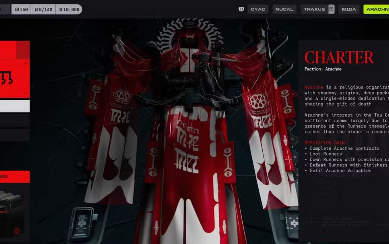 تزداد سمعة Arachne عندما يقوم اللاعب بإتمام عقود Arachne المرتبطة بالعمليات القتالية كما يمكن تعزيز السمعة من خلال نهب Runners الذين يتم القضاء عليهم أثناء الجولات حيث توفر معداتهم ومواردهم فرصة إضافية لجمع العناصر القيمة التي يهتم بها هذا الفصيل.