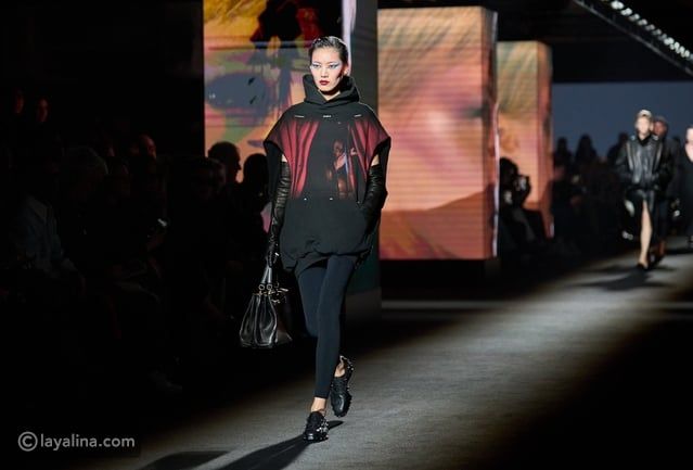 - ظلّت الأجواء متعمدة في استفزازية. معطف البونشو الجلدي الأسود عكس الطابع الليلي القاسي المرتبط بعالم عروض بالنسياغا، بينما استحضرت فساتين البومبر القصيرة، المقترنة بأحذية عالية تصل إلى الفخذ، صور رواد الحياة الليلية وهم يتجولون في شوارع المدينة.