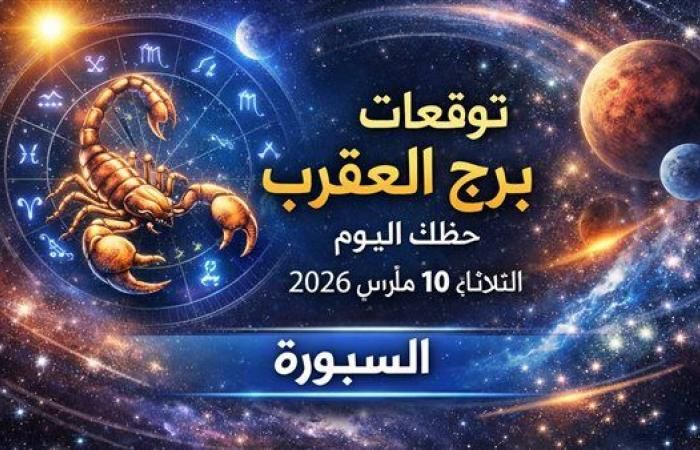 ابدأ بخطوة حاسمة، استغل كل لحظة اليوم، وتابع توقعات برج العقرب حظك اليوم الثلاثاء 10 مارس 2026 لتقلبات العمل والمال والعاطفة والصحة، حافظ على هدوئك، وراقب الفرص لتصبح السيطرة لك، ثم عد لمتابعة موقع السبورة، ويمكنك الاطلاع على التقرير الكامل لمتابعة حظك اليوم وتوقعات الأبراج لجميع الأبراج على الصعيد المالي والمهني والعاطفي والصحي.