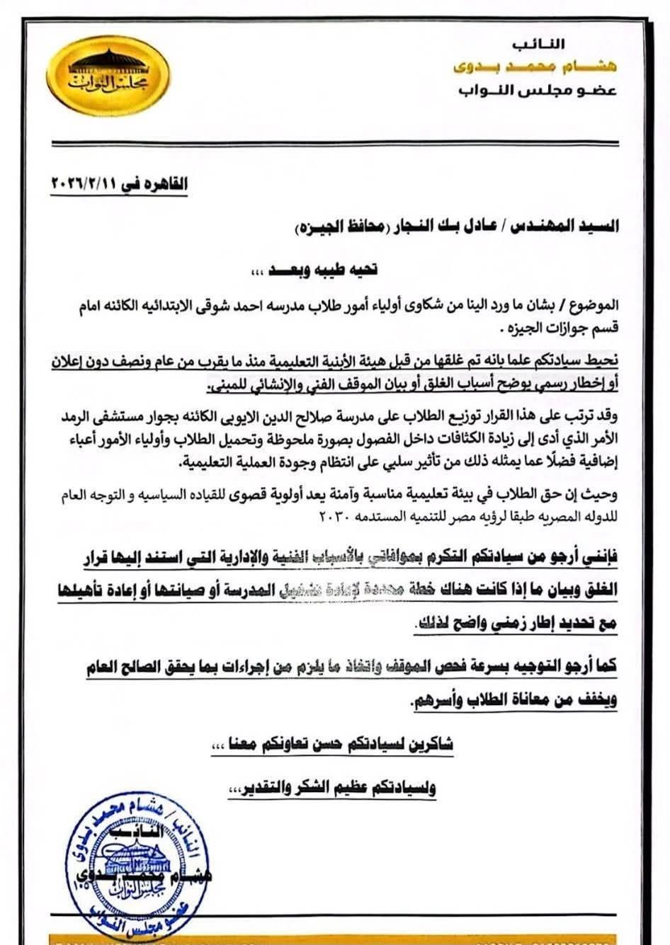تقدم هشام بدوي دسوقي عضو مجلس النواب، بطلب إلى الجهات المختصة بشأن الصيانة الدورية لبعض المدارس القائمة وإعادة تشغيل المدارس المغلقة منها منذ عدة سنوات والتي توقفت عن العمل نتيجة احتياجها لأعمال صيانة وتطوير.