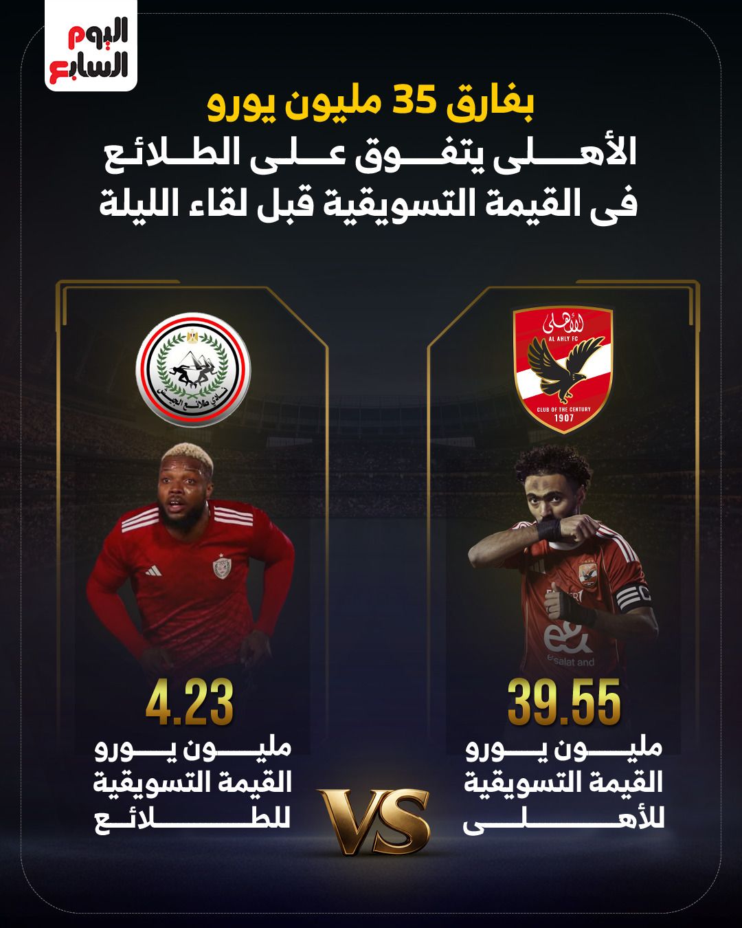 تبلغ القيمة التسويقية للأهلى 39.55 مليون يورو، فيما تبلغ القيمة التسويقية للطلائع 4.23 مليون يورو.