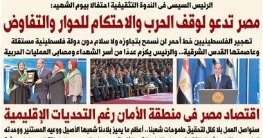 اقرأ فى العدد غدا - اقتصاد مصر فى منطقة الأمان رغم التحديات الإقليمية.. سنواصل العمل بلا كلل لتحقيق طموحات شعبنا.. أعظم ما يميز بلادنا شعبها الأصيل ووعيه المستنير ووحدتها من إشعال الفتن فى حوض النيل والقرن الأفريقى: مصر لن تسمح بجر المنطقة إلى صراعات عبثية