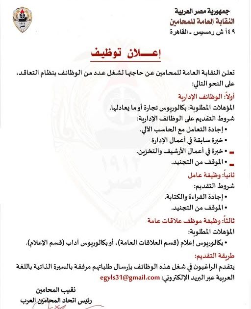 إعلان توظيف تعلن النقابة العامة للمحامين عن حاجتها لشغل عدد من الوظائف بنظام التعاقد، على النحو التالي: