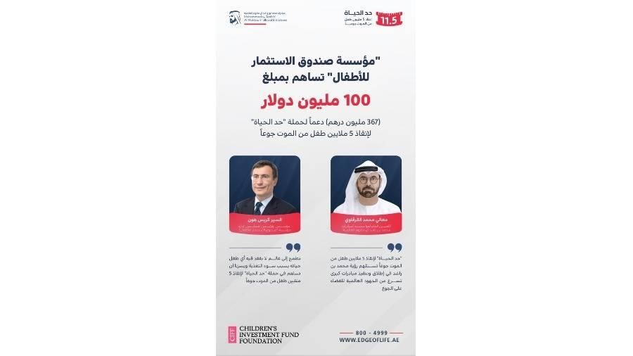 أعلنت «مؤسسة صندوق الاستثمار للأطفال» عن مساهمتها بمبلغ 100 مليون دولار (367 مليون درهم)، دعماً لحملة «حد الحياة» لإنقاذ 5 ملايين طفل من الموت جوعاً، التي أطلقها صاحب السمو الشيخ محمد بن راشد آل مكتوم نائب رئيس الدولة، رئيس مجلس الوزراء حاكم دبي، رعاه الله، بالتزامن مع شهر رمضان الكريم، لجمع مليار درهم على الأقل يتم استثمارها في مكافحة جوع الأطفال في العالم.
