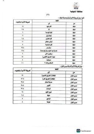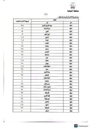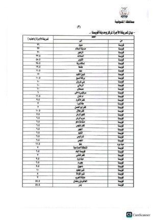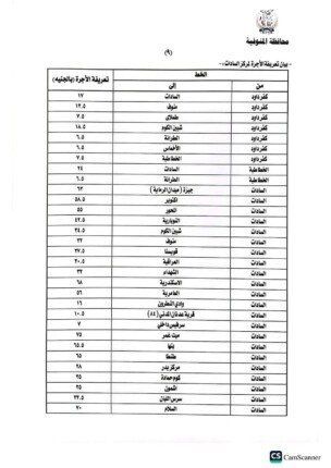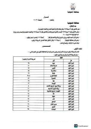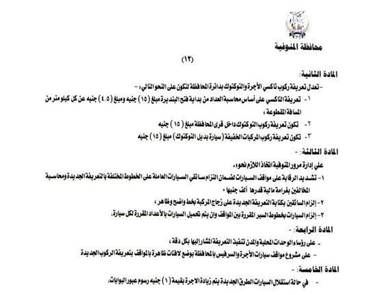 هذا وتضمنت المادة الثانية من القرار تعديل تعريفة ركوب التاكسي على أساس محاسبة العداد من بداية فتح البنديرة بمبلغ ( ١٥ ) جنية ومبلغ (٤.٥٠ ) جنية عن كل 1 كيلو متر من المسافة المقطوعة، و ( ١٥) جنيه تعريفة الركوب الجديدة لمركبات التوكتوك والسيارة بديل التوكتوك داخل قري المحافظة والسرفيس داخل مدينة شبين الكوم ٦.٥٠ ج، على أن تكون اسطوانة البوتاجاز المنزلي من ٢٢٥ جنيه الاسطوانه الي ٢٧٥، أسطوانة البوتاجاز التجاري من ٤٥٠ الي ٥٥٠ جنيه للاسطوانة.