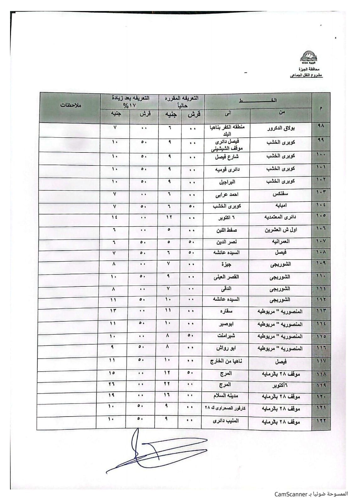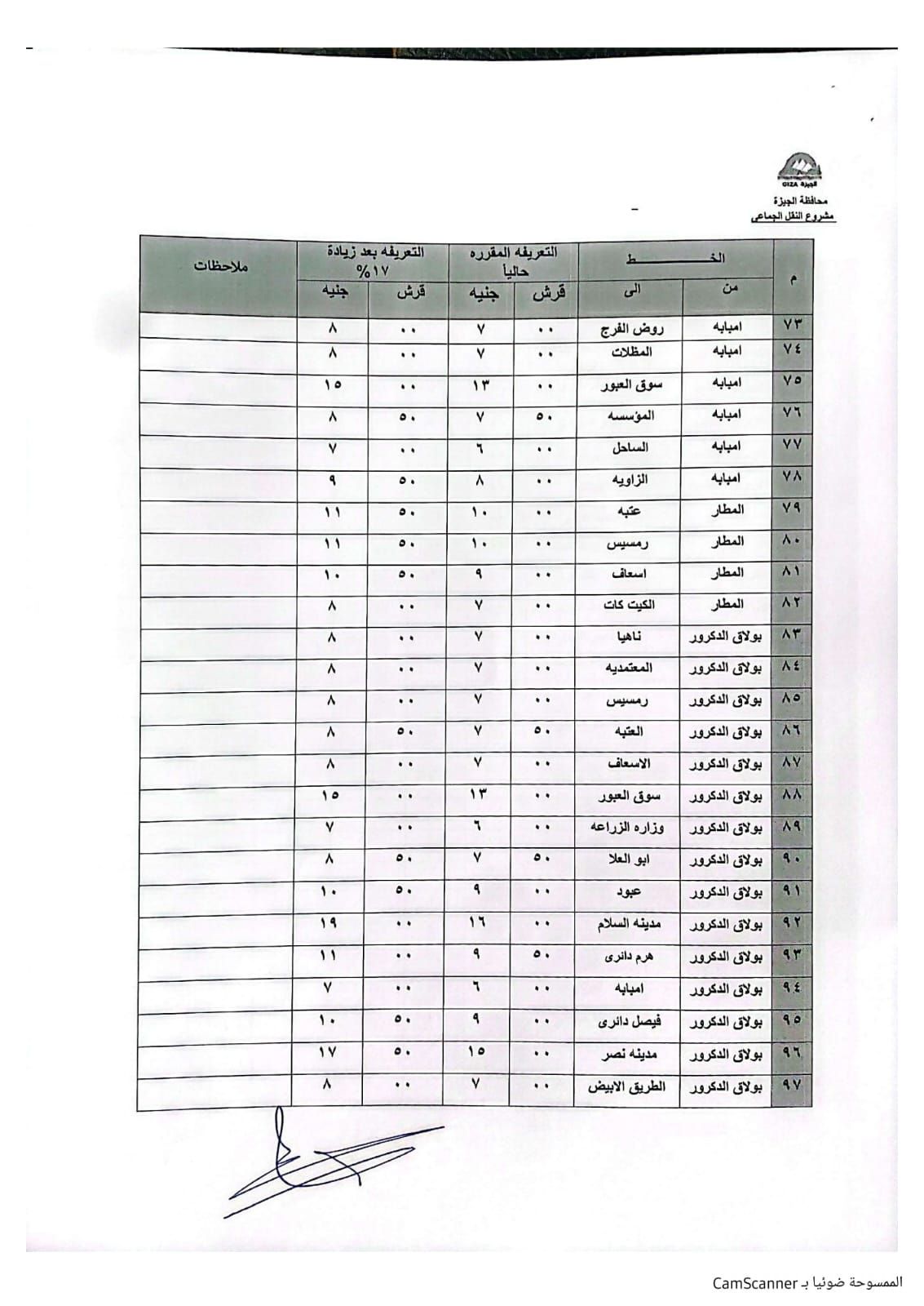 اعتمد الدكتور أحمد الأنصاري محافظ الجيزة التعريفة الجديدة لسيارات السرفيس والنقل الجماعي الداخلية والخارجية، والتي تم تطبيقها اعتبارًا من اليوم الثلاثاء، وطبقًا للجداول المرفقة، وذلك في ضوء قرار لجنة التسعير التلقائي للمنتجات البترولية بوزارة البترول بتحريك أسعار المنتجات البترولية.