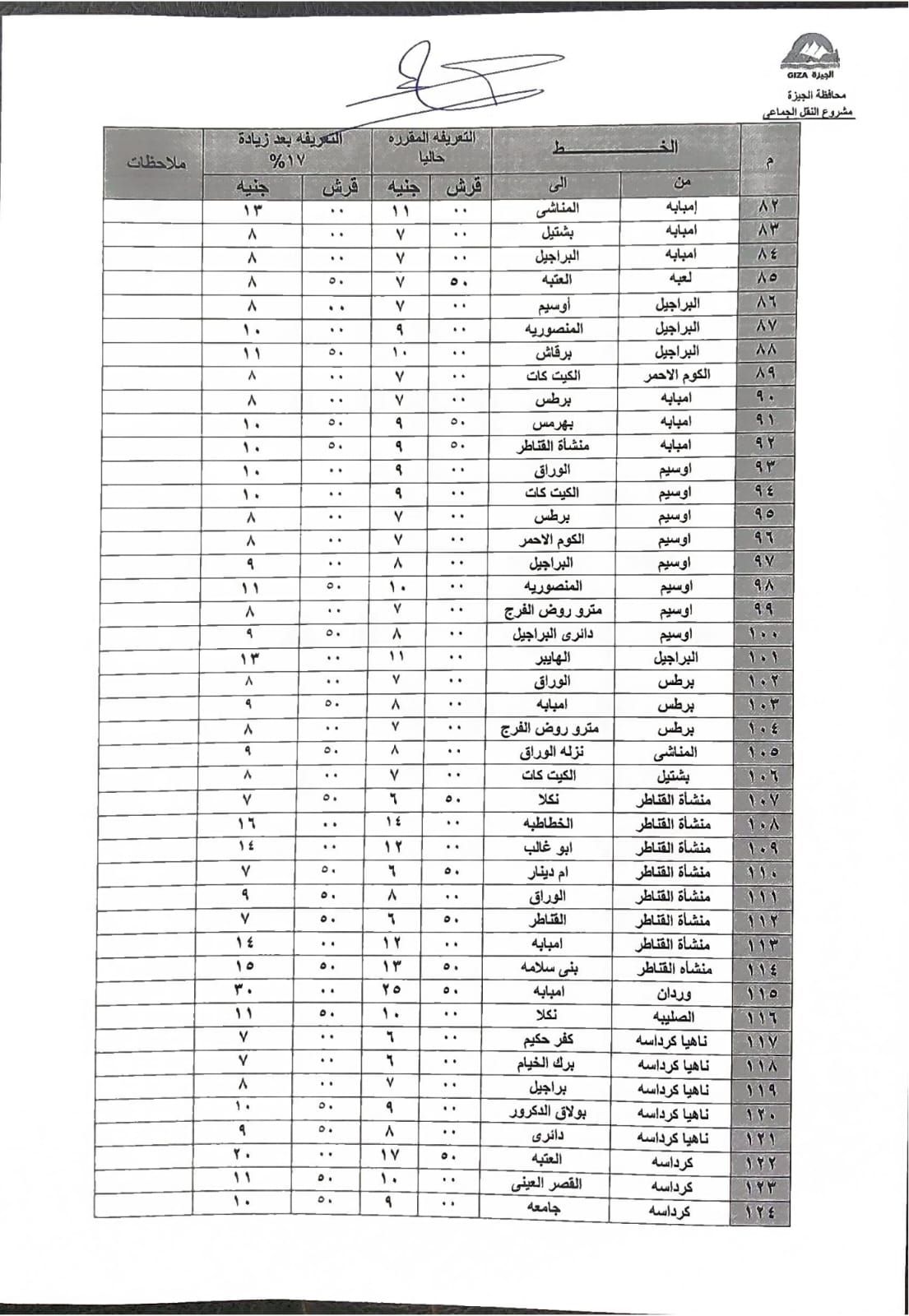 وكلف محافظ الجيزة جهاز السرفيس والأحياء والمراكز بطباعة ملصقات وبانرات بالتعريفة الجديدة والإلتزام بنشرها بالمواقف وتعليقها في مكان واضح للمواطنين والسائقين.