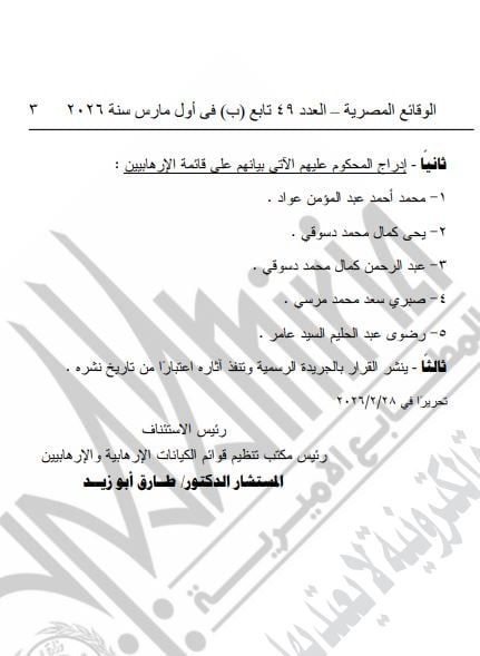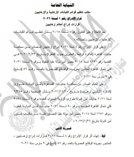 الثلاثاء، 10 مارس 2026 11:04 صنشرت الجريدة الرسمية، قرار النيابة العامة رقم 1 لسنة 2026 لسنة 2026، قرارات إدراج أحكام إرهابية، بشان إنهاء أثر قرار الإدراج رقم 8 لسنة 2021، قرارات إدراج إرهابيين.