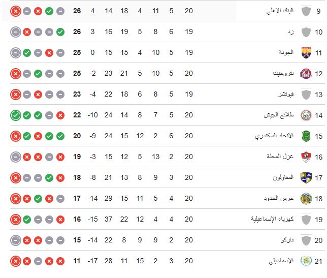 الثلاثاء، 10 مارس 2026 04:30 ماستقر 13 فريقاً في مجموعة تجنب الهبوط بالدوري، وذلك بعد الهزيمة التي تلقاها أمس فريق البنك الأهلي أمام بيراميدز بهدف نظيف، في مباراة الجولة 15 والمؤجلة من عمر البطولة المحلية، ليبتعد تماماً عن المنافسة على المركز السابع، والتي باتت منحصرة حالياً بين فريقي، إنبي ووادي دجلة.