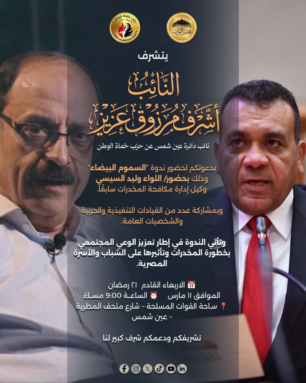 الثلاثاء، 10 مارس 2026 11:40 مفي إطار توجيهات الرئيس عبد الفتاح السيسي بضرورة تكثيف جهود التوعية لحماية الشباب من المخاطر، أعلن النائب أشرف مرزوق عزيز ، عضو مجلس النواب عن دائرة عين شمس وعضو حزب حماة الوطن، عن تنظيم ندوة توعوية بعنوان "السموم البيضاء"