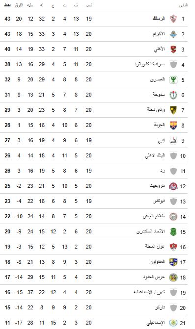 فيما يحتل فريق بيراميدز المركز الثاني بفارق الأهداف عن الزمالك المتصدر والذي يخوض مباراته غدا أمام انبي في ختام الدور الأول لبطولة الدوري، بينما يحتل النادي الاهلي المركز الثالث برصيد 40 نقطة.