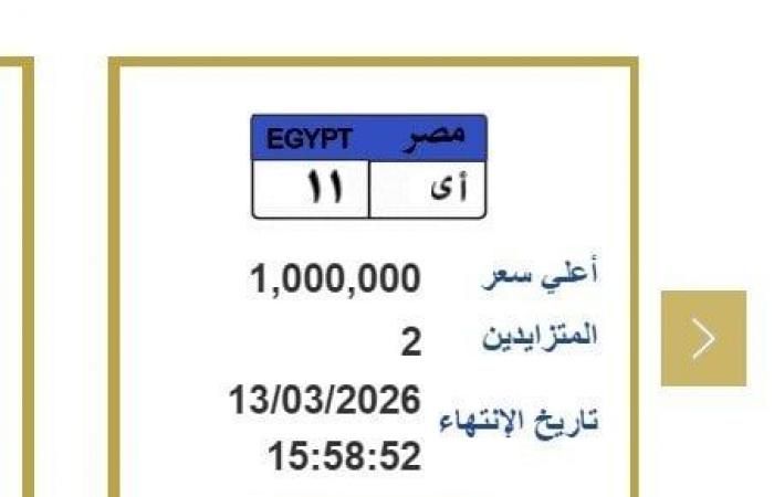 أعلنت بوابة مرور مصر الإلكترونية طرح لوحة سيارة مميزة تحمل الحروف «أ - ي - 11»، حيث وصل سعرها في المزايدة إلى نحو مليون جنيه، مع تنافس شخصين عليها حتى الآن، موضحة أن موعد انتهاء المزايدة على هذه اللوحة المعدنية سيكون يوم الجمعة 13 مارس 2026 في تمام الساعة الثالثة عصرًا.