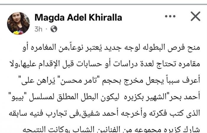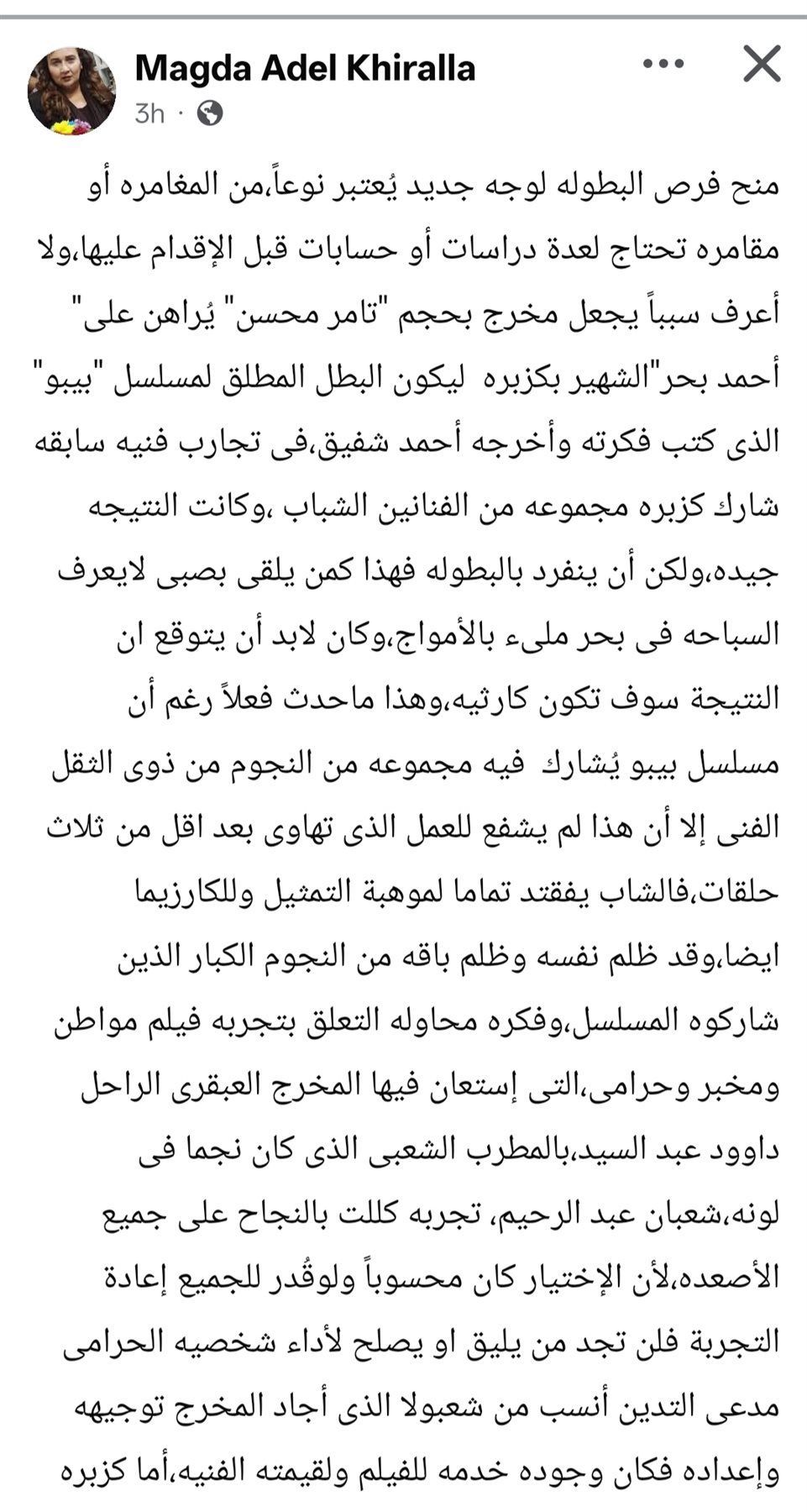 وكتبت، عبر حسابها على موقع التواصل الاجتماعي «فيس بوك»: «منح فرص البطوله لوجه جديد يُعتبر نوعًا من المغامرة أو مقامرة تحتاج لعدة دراسات أو حسابات قبل الإقدام عليها، ولا أعرف سببًا يجعل مخرج بحجم تامر محسن يُراهن على أحمد بحر، الشهير بكزبرة، ليكون البطل المطلق لمسلسل بيبو الذي كتب فكرته وأخرجه أحمد شفيق».