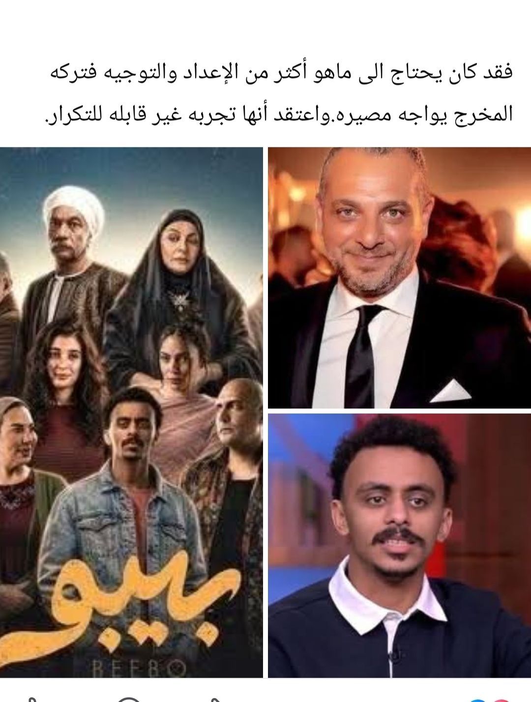 وأضاف: «وهذا ماحدث فعلًا رغم أن مسلسل بيبو يُشارك فيه مجموعة من النجوم من ذوي الثقل الفني إلا أن هذا لم يشفع للعمل الذي تهاوى بعد أقل من ثلاث حلقات، فـ الشاب يفقتد تمامًا لموهبة التمثيل وللكارزيما أيضًا، وقد ظلم نفسه وظلم باقه من النجوم الكبار الذين شاركوه المسلسل».