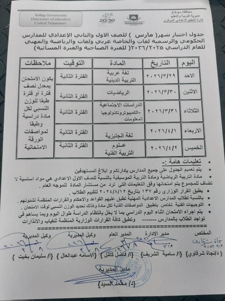 الخميس، 12 مارس 2026 06:00 صأعلنت مديرية التربية والتعليم بمحافظة سوهاج، جدول اختبارات شهر مارس للصفين الأول والثاني الإعدادي بالمدارس الحكومية والرسمية لغات والخاصة عربي ولغات والرياضية والمهني، وذلك للفصل الدراسي الثاني للعام الدراسي 2025 / 2026، على أن تُعقد الامتحانات خلال الفترة الصباحية والمسائية وفقًا لظروف كل مدرسة.
