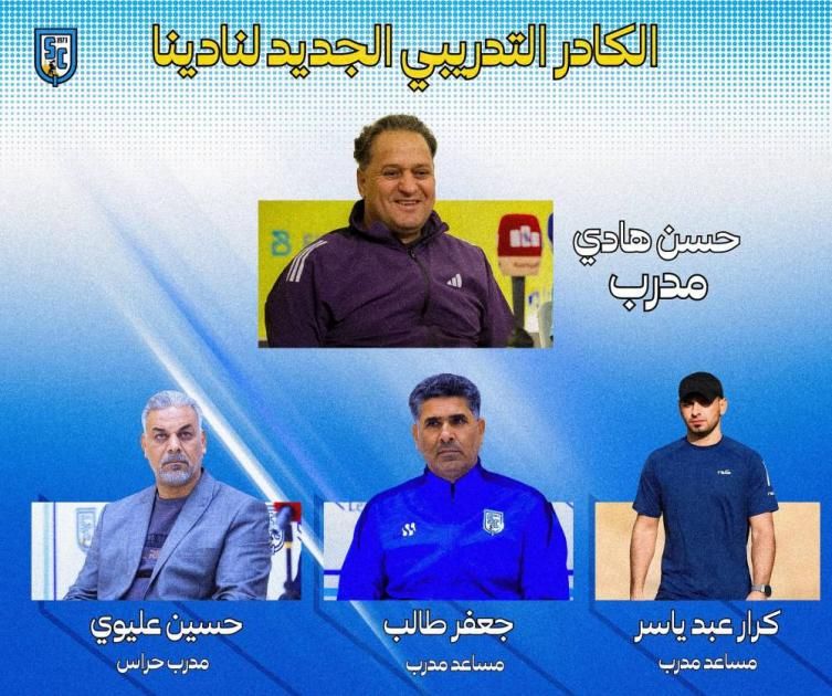 وأضافت: «جاءت التسميات د. حسن هادي مدرباً للفريق، جعفر طالب، كرار عبد ياسر مساعدين للمدرب، وحسين عليوي، مدرباً لحراس المرمى».