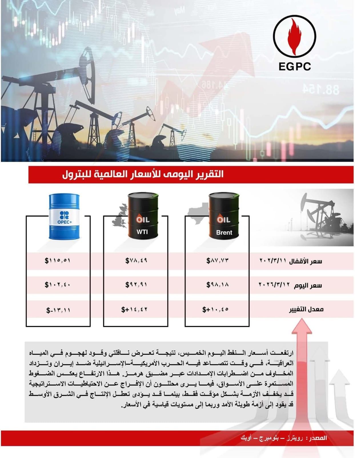الخميس، 12 مارس 2026 12:25 مارتفعت أسعار النفط اليوم الخميس، نتيجة تعرض ناقلتي وقود لهجوم في المياه العراقية، في وقت تتصاعد فيه الحرب الأمريكية الإسرائيلية ضد إيران.