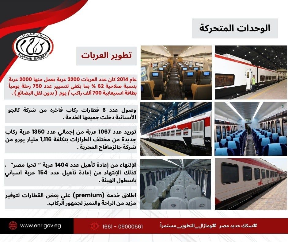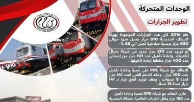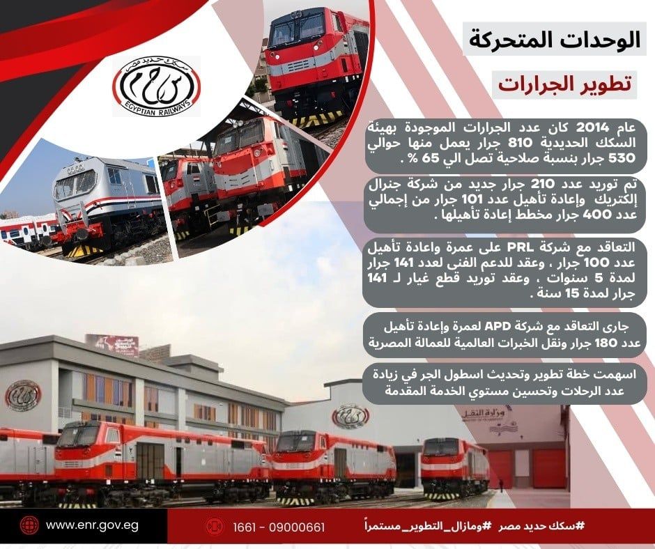الخميس، 12 مارس 2026 03:35 مشهدت منظومة الوحدات المتحركة بهيئة السكك الحديدية طفرة غير مسبوقة منذ عام 2014 وحتى الآن، حيث تحولت المنظومة من حالة التراجع بنسب صلاحية ضئيلة إلى أسطول حديث يضاهي المستويات العالمية، وذلك من خلال خطة شاملة لتوريد الجرارات والعربات الجديدة وإعادة تأهيل الأسطول الحالي.