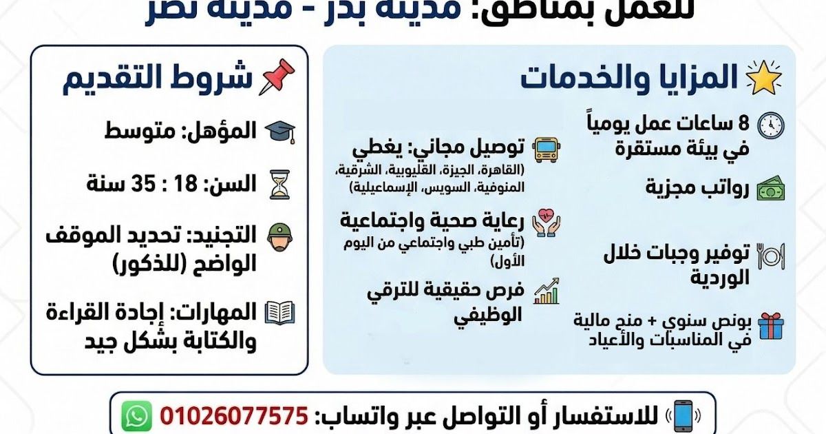 ملحوظة: مضمون هذا الخبر تم كتابته بواسطة وظائف ولا يعبر عن وجهة نظر مصر اليوم وانما تم نقله بمحتواه كما هو من وظائف ونحن غير مسئولين عن محتوى الخبر والعهدة علي المصدر السابق ذكرة.