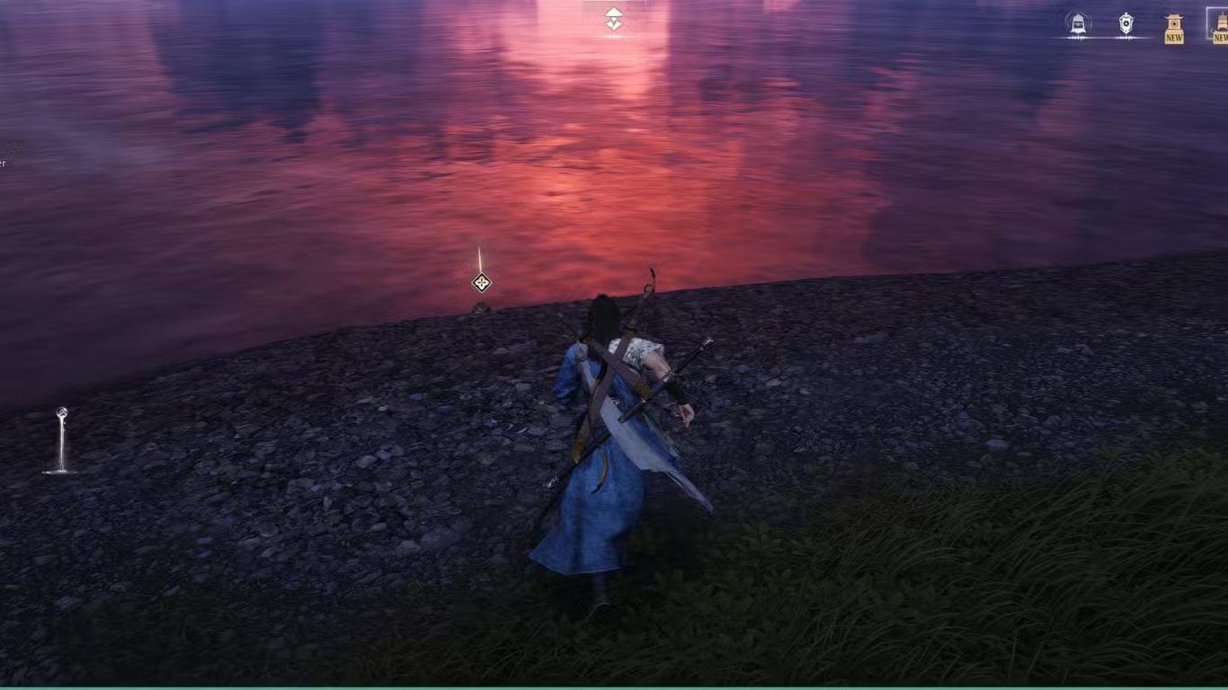 عند الوصول إلى الشاطئ سيلاحظ اللاعب وجود حقيبة غامضة ملقاة على الأرض بالقرب من الماء وتبدو هذه الحقيبة وكأنها تركت هناك بشكل متعمد وتعد هذه الحقيبة العنصر الذي يطلق المرحلة التالية من القصة حيث يجب على اللاعب التفاعل معها لبدء المهمة التي تقود مباشرة إلى الخط السردي المرتبط بتوسعة Hexi داخل لعبة Where Winds Meet.