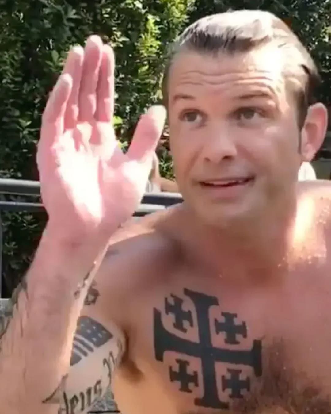 يقول هيغسيث إن أحد وشومه - صليب القدس، وهو رمز ديني مرتبط بالحروب الصليبية - أدى إلى وصفه بالمتطرف واستبعاده من مهمة وحدته لحضور حفل تنصيب الرئيس السابق جو بايدن في عام 2021. وتعود جذور هذه الصورة إلى الحروب الصليبية، عندما حاول المسيحيون الأوروبيون استعادة الأرض المقدسة من المسلمين.