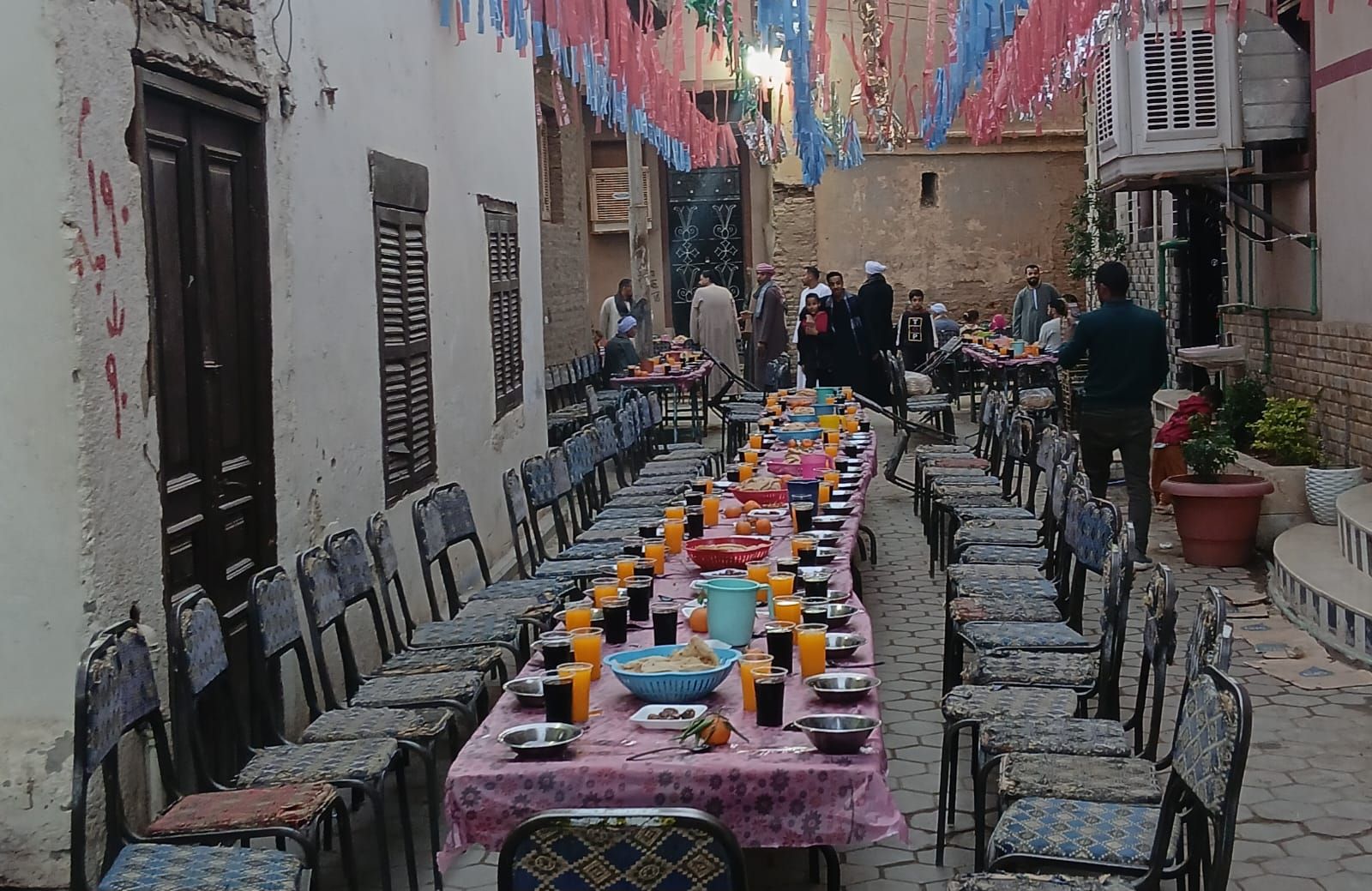 شهر اللمة والتجمع فهنا في قنا لم يقتصر الأمر على التجمع الأسري على مائدة الطعام، بل امتد إلى تجمع الآلاف على مائدة واحدة في إفطارات جماعية بأماكن عدة جنوبا وشمالا في قلب مدينة قنا، وذلك على مدار شهر رمضان المبارك، هنا في مدينة نقادة نظم عدد من الأهالي إفطارا بطول 500 متر، تجمع عليه الصغير والكبير، وشرع الجميع في المساعدة بالإعداد والتجهيز.