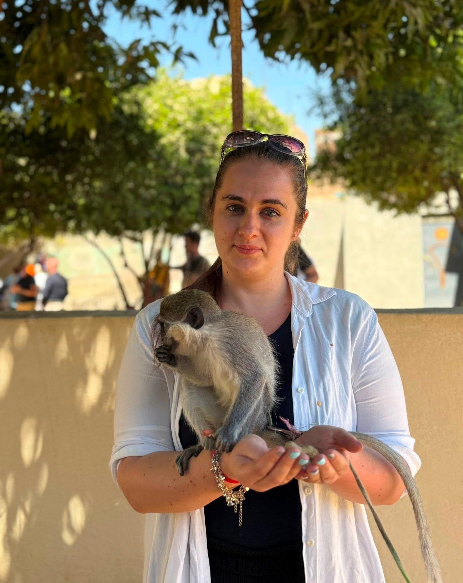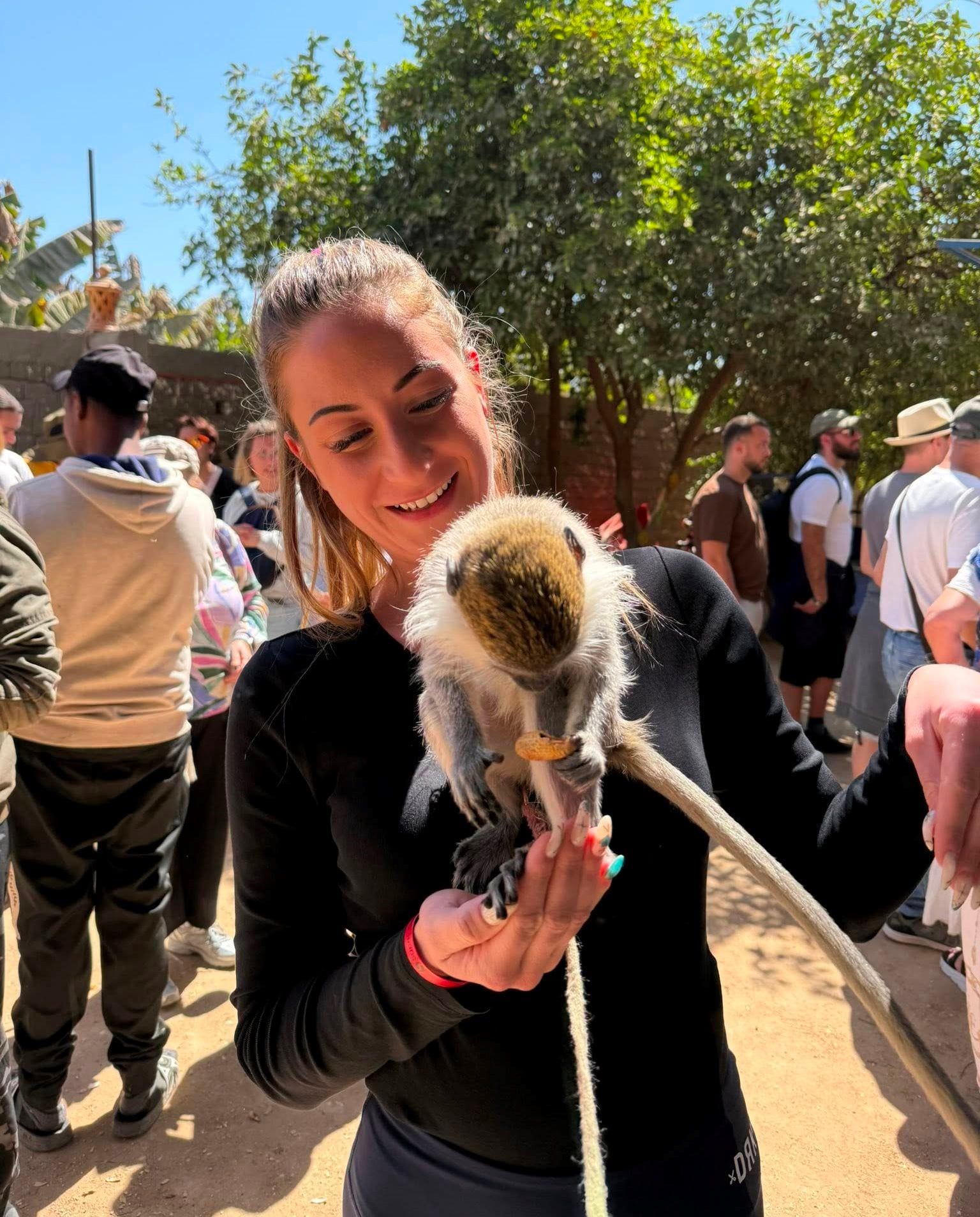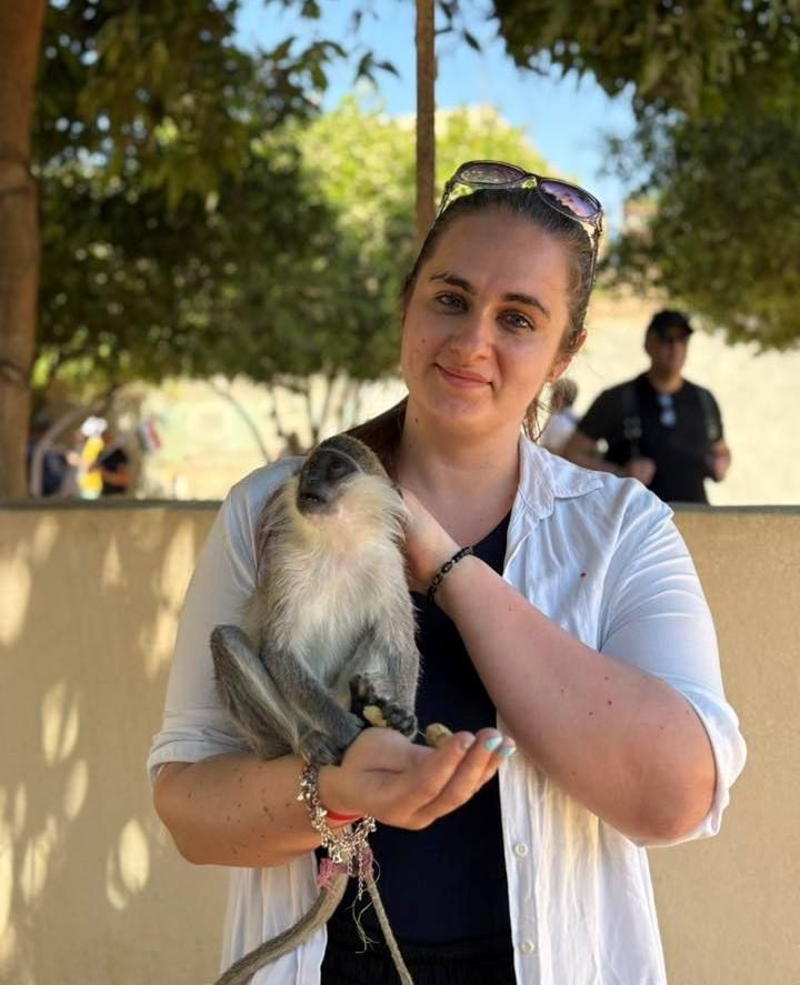 بهجة سائحة أجنبية تستمتع مع القرود غرب الأقصر