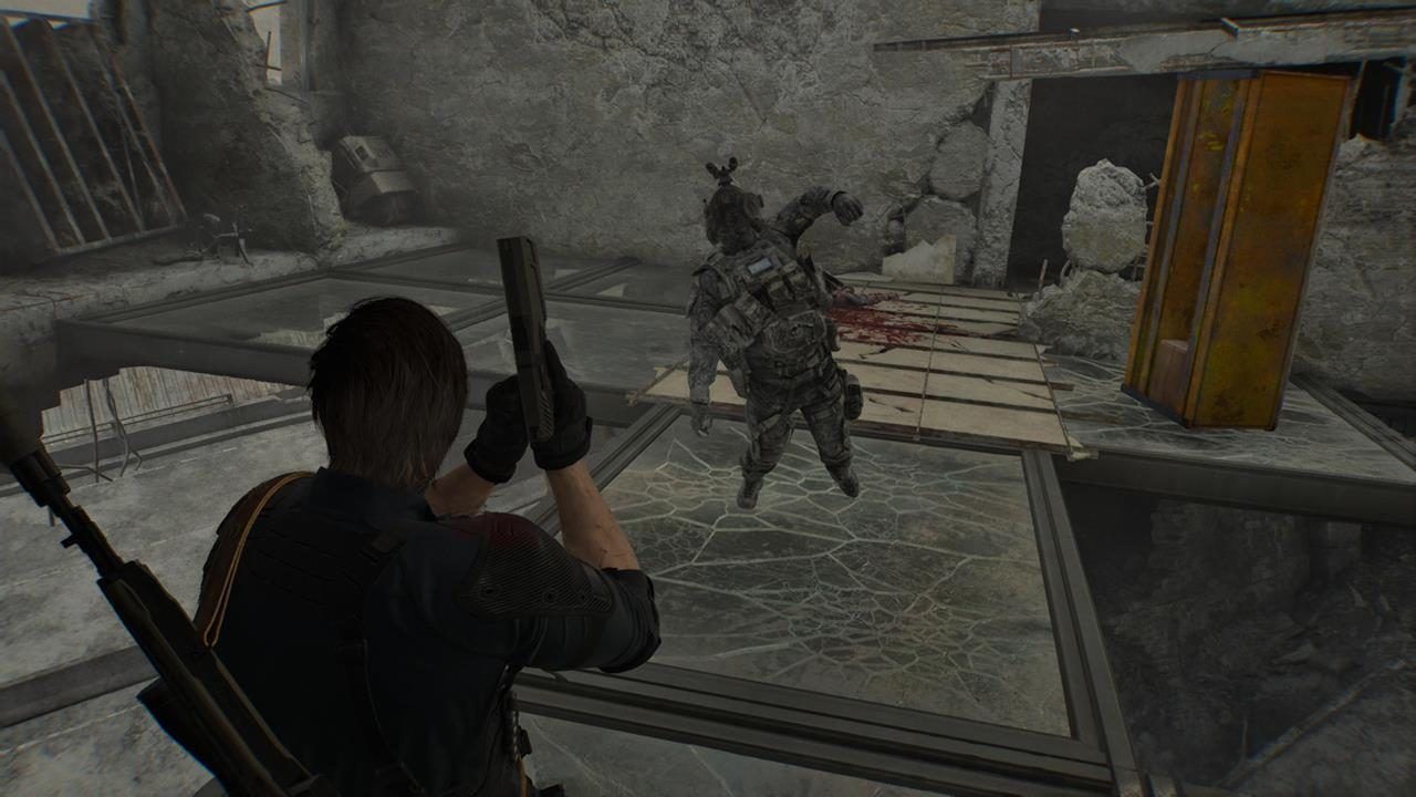 بعد ذلك بقليل، يجب على ليون عبور غرفة مقلوبة، أي أن الأرضية تتكون من زجاج هش، يمكن إطلاق النار على الزجاج لإسقاط الأعداء إلى الموت، لكن إذا أطلقت النار على اللوح الخطأ أو أخطأت في التقدير، قد ينكسر الزجاج تحت أقدام ليون، مما يؤدي إلى سقوطه وموته المفاجئ، وبالتالي يجب على اللاعب دراسة الغرفة بعناية واختيار الألواح بعناية لضمان عبور آمن دون خسائر.