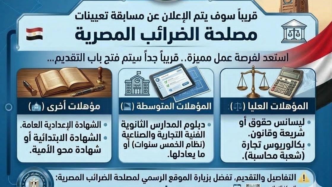 عاجل مصلحة الضرائب المصرية تعلن عن مسابقات توظيف جديدة فرصة حكومية للمؤهلات العليا والمتوسطة والاعدادية