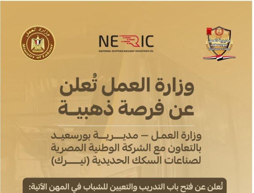 أعلنت مديرية العمل بمحافظة بورسعيد، عن فتح باب التقدم لبرنامج تدريبي موسع ينتهي بالتشغيل بالتعاون مع الشركة الوطنية المصرية لصناعات السكك الحديدية (نيرك - NERIC). يأتي هذا البرنامج برعاية وزير العمل، حسن رداد، وتوجيهات اللواء إبراهيم أبو ليمون، محافظ بورسعيد، في إطار خطة الدولة لتوفير فرص عمل حقيقية للشباب وتأهيلهم للعمل في القلاع الصناعية الكبرى بشرق التفريعة.