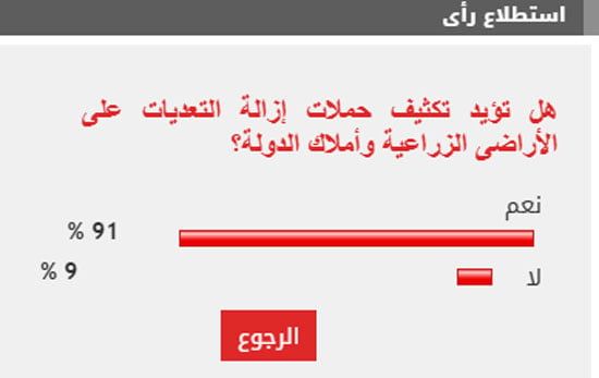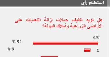 وأيد 91% من القراء مطالب تكثيف حملات إزالة التعديات على الأراضى الزراعية وأملاك الدولة، بينما عارض 9% من القراء مطالب تكثيف حملات إزالة التعديات على الأراضى الزراعية وأملاك الدولة.