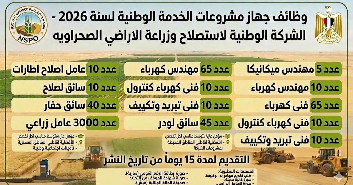 وظائف خالية تعلن الشركة الوطنية لاستصلاح وزراعة الأراضي الصحراوية إحدى شركات جهاز مشروعات الخدمة الوطنية عن حاجتها لشغل بعض الوظائف نظراً للتوسعات الزراعية وذلك بنظام التعاقد محدد المدة للعمل بمواقع الشركة بـ ( شرق العوينات / الفرافرة / توشكي / عين داله )