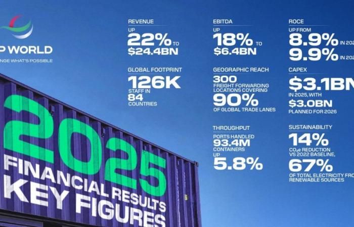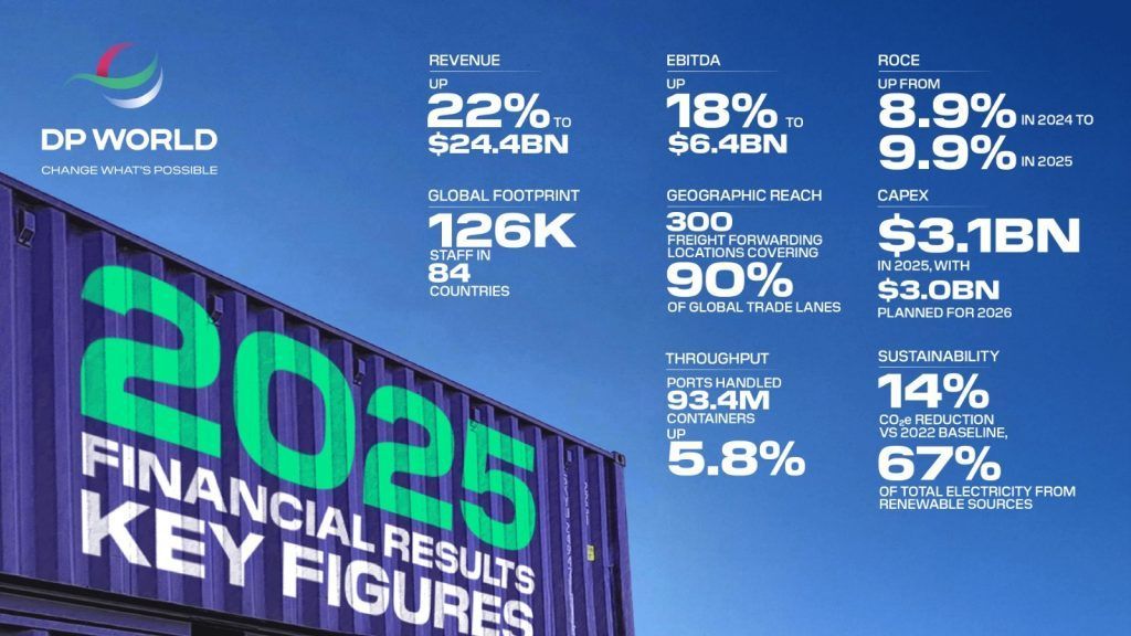 أعلنت مجموعة موانئ دبي العالمية “دي بي ورلد” عن تحقيق نتائج مالية قياسية لعام 2025، مع ارتفاع الإيرادات بنسبة 22% لتصل إلى 24.4 مليار دولار أمريكي، وارتفاع الأرباح قبل الفوائد والضرائب والإهلاك والاستهلاك بنسبة 18% لتسجل 6.4 مليار دولار بهامش 26.3%.
