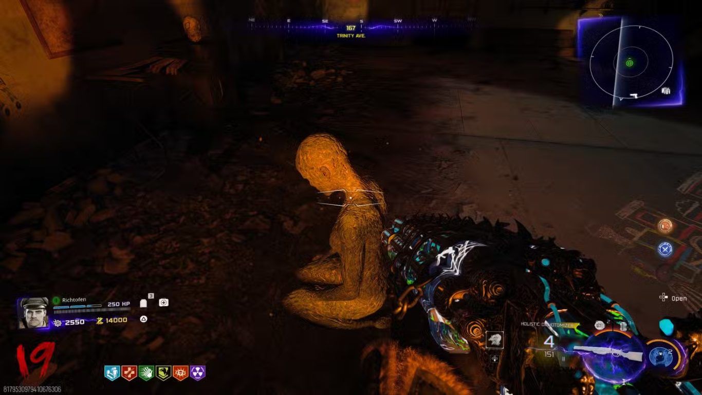 بمجرد تفجير مركبة ARC XD وفتح باب المرآب السري يصبح بإمكان اللاعب الدخول إلى داخل المرآب الموجود في Trinity Avenue حيث سيلاحظ وجود جثة زومبي ملقاة على الأرض داخل المرآب ويجب الاقتراب من هذه الجثة والتفاعل معها حيث يؤدي هذا التفاعل إلى حدوث تأثير خاص داخل الخريطة إذ تبدأ الجثة بالاختفاء تدريجيًا حتى تتلاشى بالكامل أمام اللاعب.