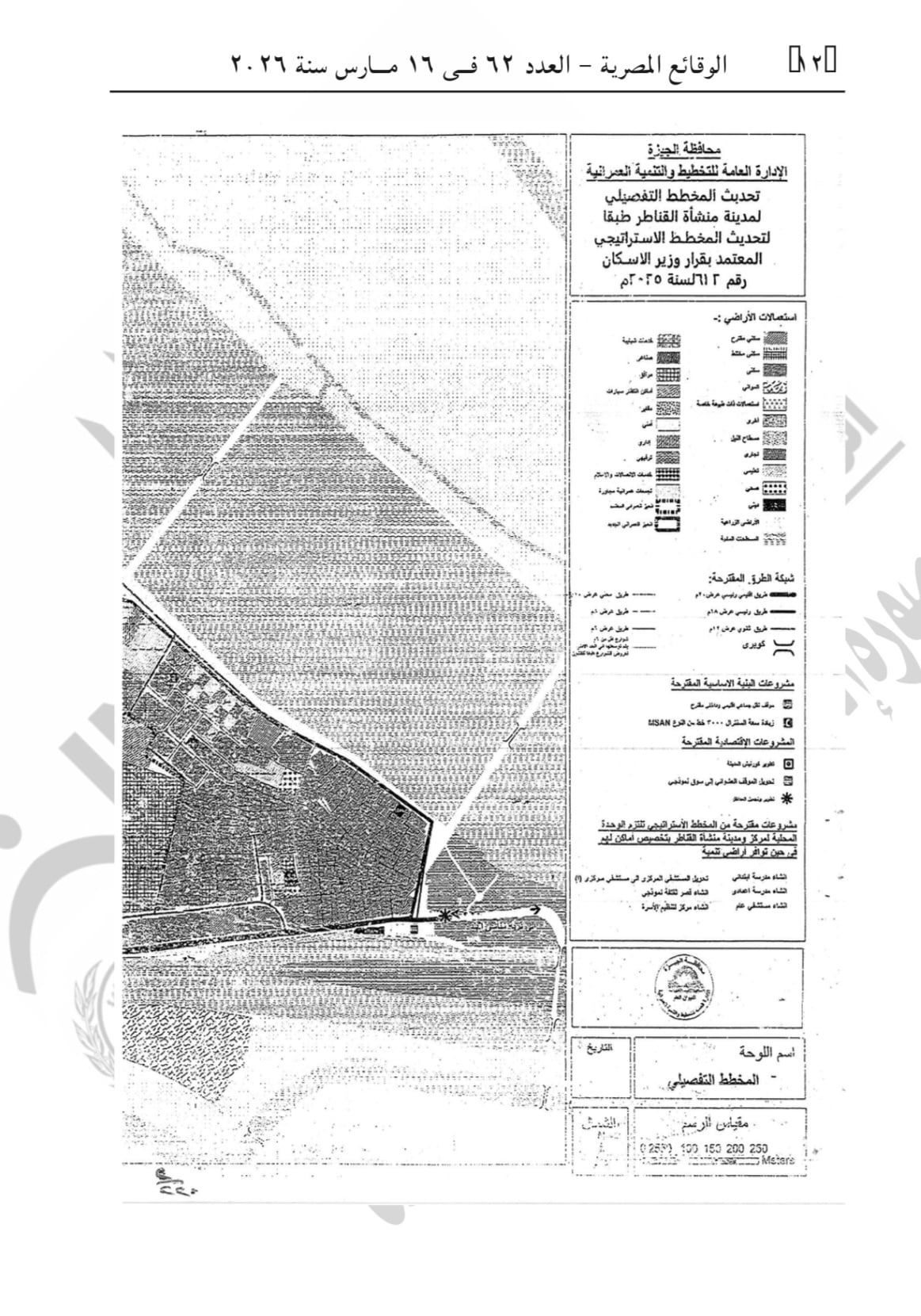 الإثنين، 16 مارس 2026 10:11 صنشرت الجريدة الرسمية في عددها رقم 62 الصادر بتاريخ 16 مارس 2026، قرار محافظ الجيزة، اعتماد المخطط التفصيلي لمدينة منشأة القناطر.