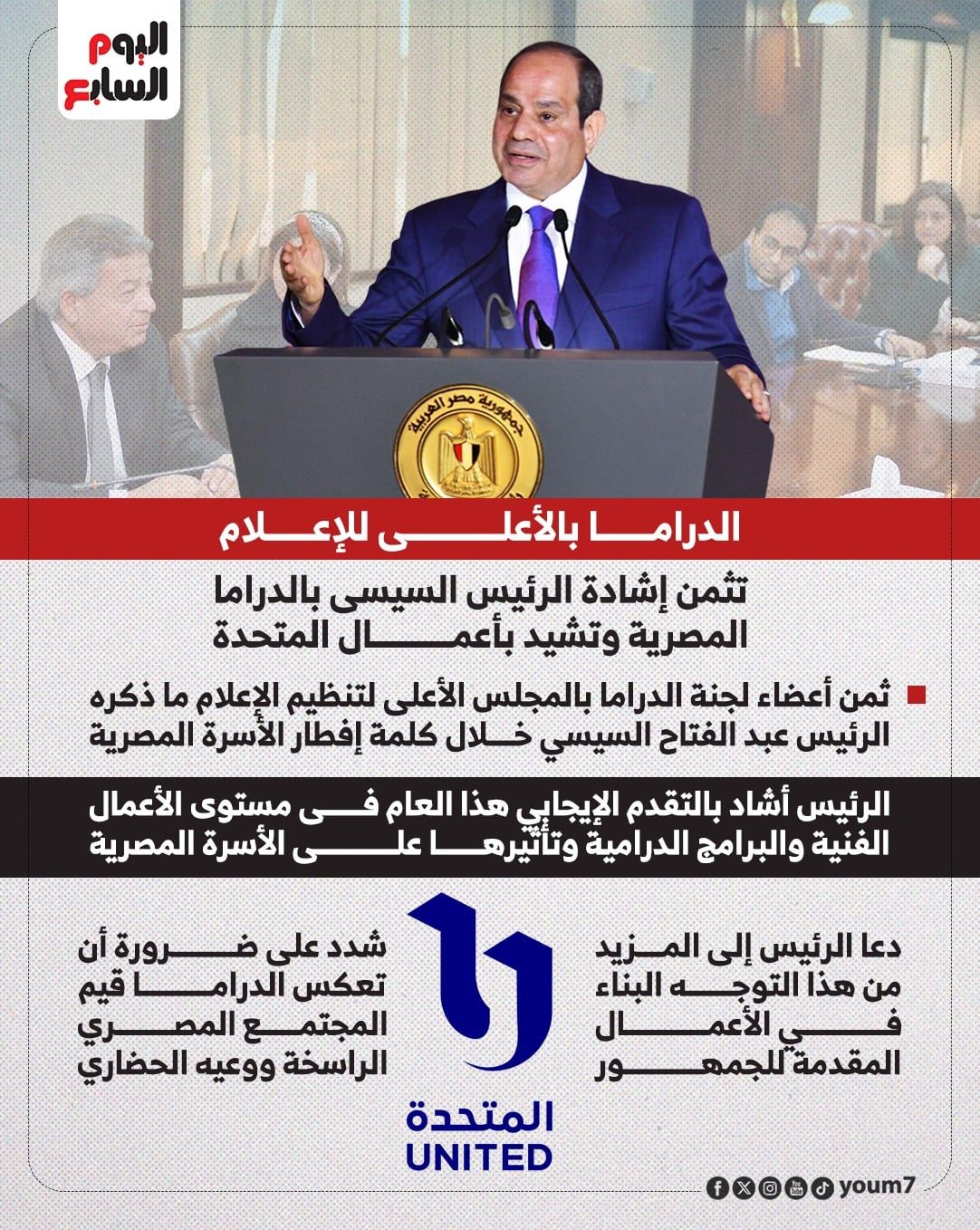 وأشادت اللجنة بما ذكره الرئيس عبد الفتاح السيسي، رئيس الجمهورية، خلال كلمته في حفل إفطار الأسرة المصرية، حول التقدم الإيجابي هذا العام فيما يتعلق بمستوى الأعمال الفنية والبرامج الدرامية وتأثيرها على الأسرة المصرية، مطالبا بالمزيد من هذا التوجه البناء في الأعمال المقدمة للجمهور والمساهمة في بناء وجدان وطني يليق بمصر ومكانتها، ويعبر عن رسالتها الثقافية الممتدة عبر العصور.