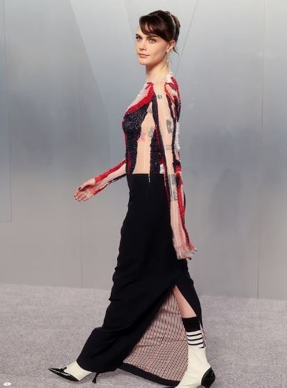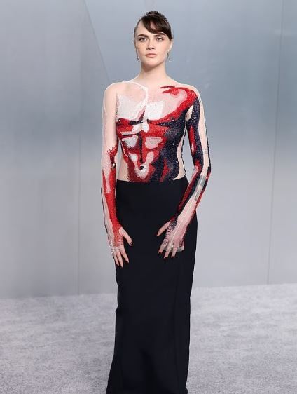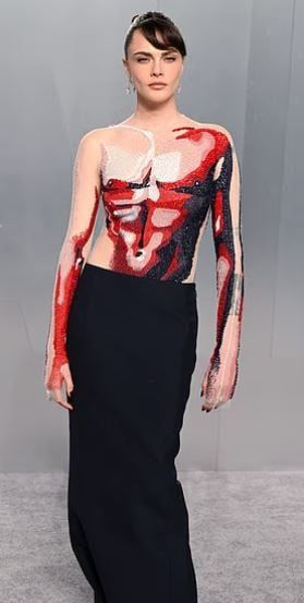 ارتدت كارا فستاناً فريداً على شكل عضلات، يجمع بين الجزء العلوي الشفاف المزخرف بألوان الأحمر والأبيض والأزرق، وتنتهي بتنورة سوداء، أكملت الفستان بحذاء أسود وأبيض غريب التصميم مع جوارب طويلة مخططة، ورفعت شعرها البني بتسريحة ذيل الحصان مع فرق جانبي، وأضافت لمسة من التألق عبر أقراط فضية متدلية، وظهرت بمفردها على السجادة الحمراء مبتسمة للكاميرات.