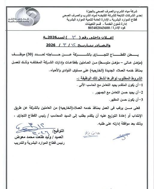 إعلان داخلی رقم (3) لسنة 2026 والصادر بتاريخ 12/3/2026 شركة مياه الشرب والصرف الصحى بالجيزة