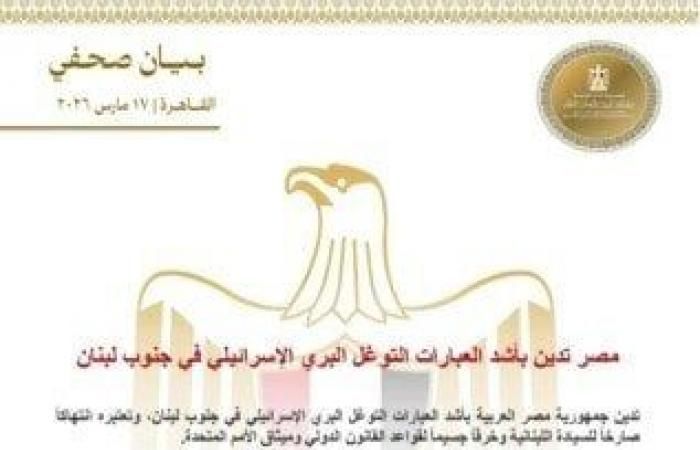 أدانت جمهورية مصر العربية، بأشد العبارات التوغل البري الإسرائيلي في جنوب لبنان، وتعتبره انتهاكًا صارخًا للسيادة اللبنانية وخرقًا جسيمًا القواعد القانون الدولي وميثاق الأمم المتحدة.