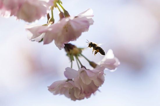 نحلة تجمع الرحيق من زهرة كرز تحت أشعة الشمس في يوم ربيعي