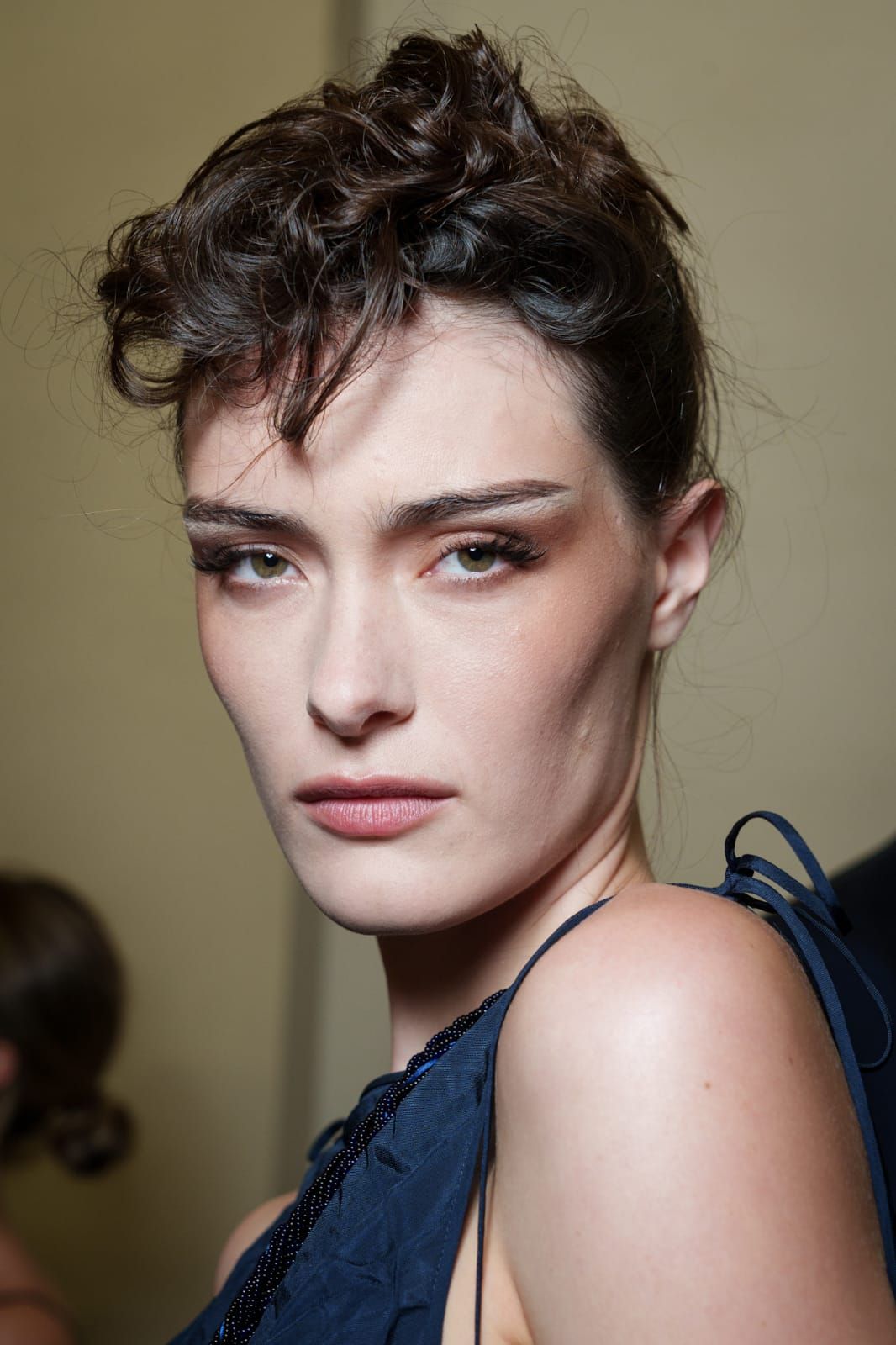 تتميز هذه التسريحة بأسلوبها الحيوي الذي يجمع بين العفوية والأناقة، حيث تم رفع الشعر إلى الأعلى وتشكيله في كعكة فوضوية ناعمة مع ترك خصلات مموجة وغير منتظمة تمنح التسريحة حركة طبيعية وجاذبية لافتة. كما تظهر بعض الخصلات القصيرة حول مقدمة الرأس لتضفي لمسة شبابية وعصرية مستوحاة من إطلالات منصات الموضة.