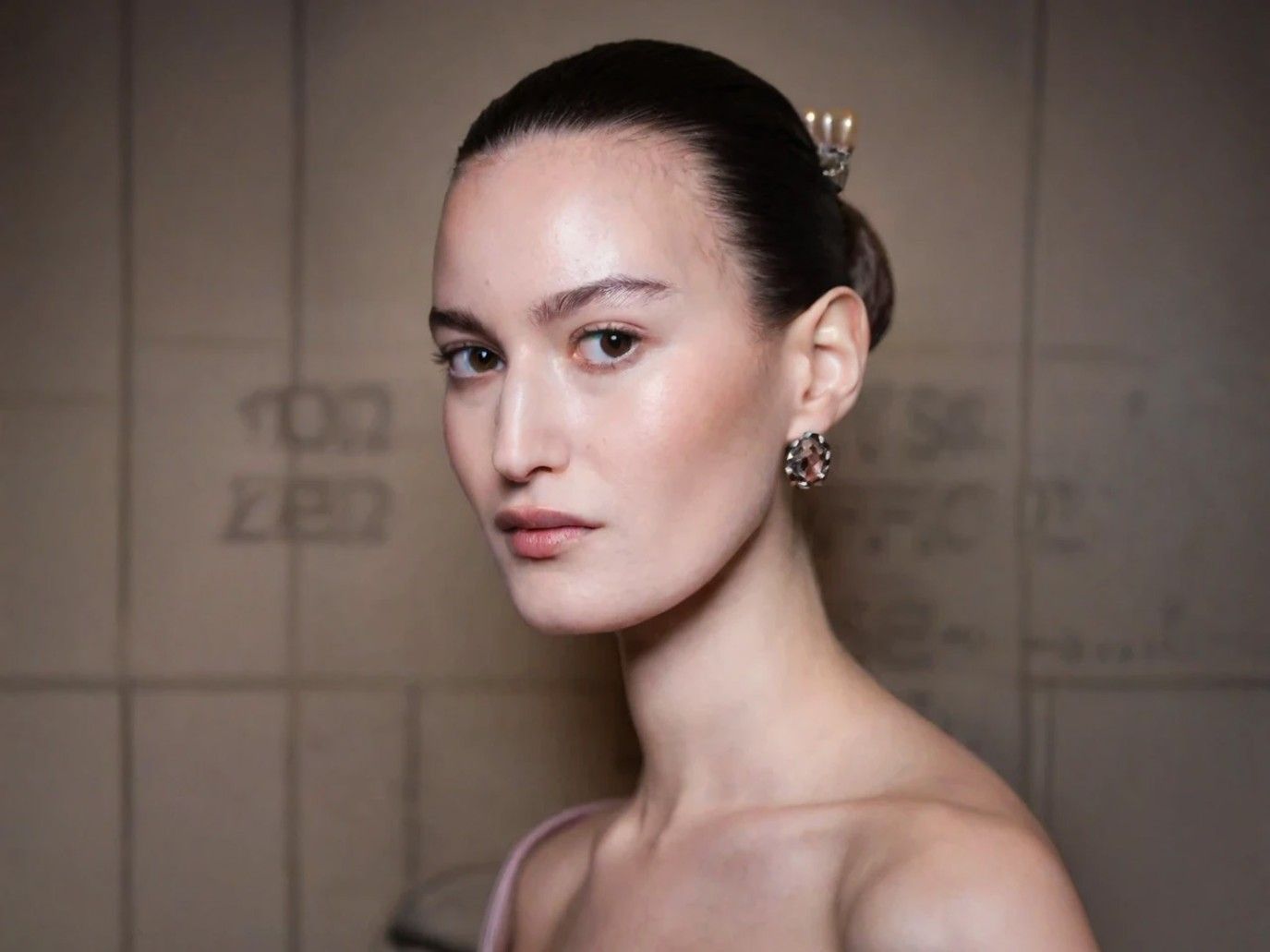 تعتمد هذه التسريحة على تصفيف الشعر بأسلوب مشدود وناعم إلى الخلف، ثم تشكيله في كعكة منخفضة مضفرة عند مؤخرة الرأس، حيث تظهر تفاصيل الضفيرة ملتفة حول الكعكة لتمنحها بعداً جمالياً مميزاً. كما زينت مقدمة الشعر بحبات اللؤلؤ الصغيرة الموزعة على الخصلات بشكل متناغم، ما يضفي لمسة فاخرة مستوحاة من إطلالات عروض الأزياء الراقية.