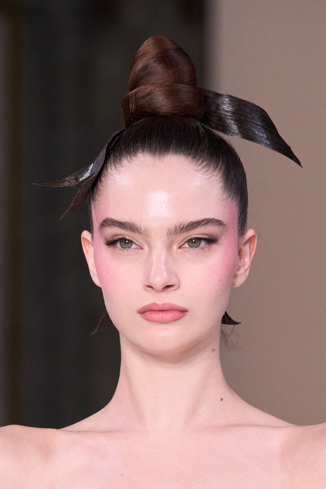 تعكس هذه التسريحة أسلوباً جريئاً وعصرياً مستوحى من منصات عروض الأزياء، حيث تم رفع الشعر بالكامل إلى أعلى الرأس بأسلوب مشدود وناعم يمنح الإطلالة طابعاً أنيقاً ونظيفاً. وقد صممت تسريحة الكعكة العالية بشكل مبتكر يشبه العقدة الكبيرة، مع خصلات ممدودة على الجانبين لتبدو كأنها شريط شعر منحوت بعناية، ما يضيف لمسة فنية مميزة إلى التسريحة.