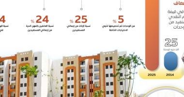 وأشارت الإنفوجرافات إلى أن حجم الدعم الذي حصل عليه المستفيدين بلغ 27 مليار جنيه، كما بلغت نسبة الدعم للمستحقين 50% - 60% من إجمالي قيمة الوحدة، ويتم تقديم الدعم ضمن منظومة متكاملة تشمل: الدعم النقدي المباشر، ودعم تكلفة التمويل العقاري، ودعم المرافق والأراضي، ودعم سعر العائد بالتعاون مع وزارة المالية.