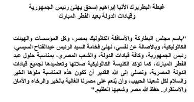 هنأ البطريرك الأنبا إبراهيم إسحق، بطريرك الإسكندرية للأقباط الكاثوليك ورئيس مجلس البطاركة والأساقفة الكاثوليك بمصر، الرئيس عبد الفتاح السيسي، رئيس الجمهورية، وكافة قيادات الدولة والشعب المصري، بمناسبة حلول عيد الفطر المبارك.