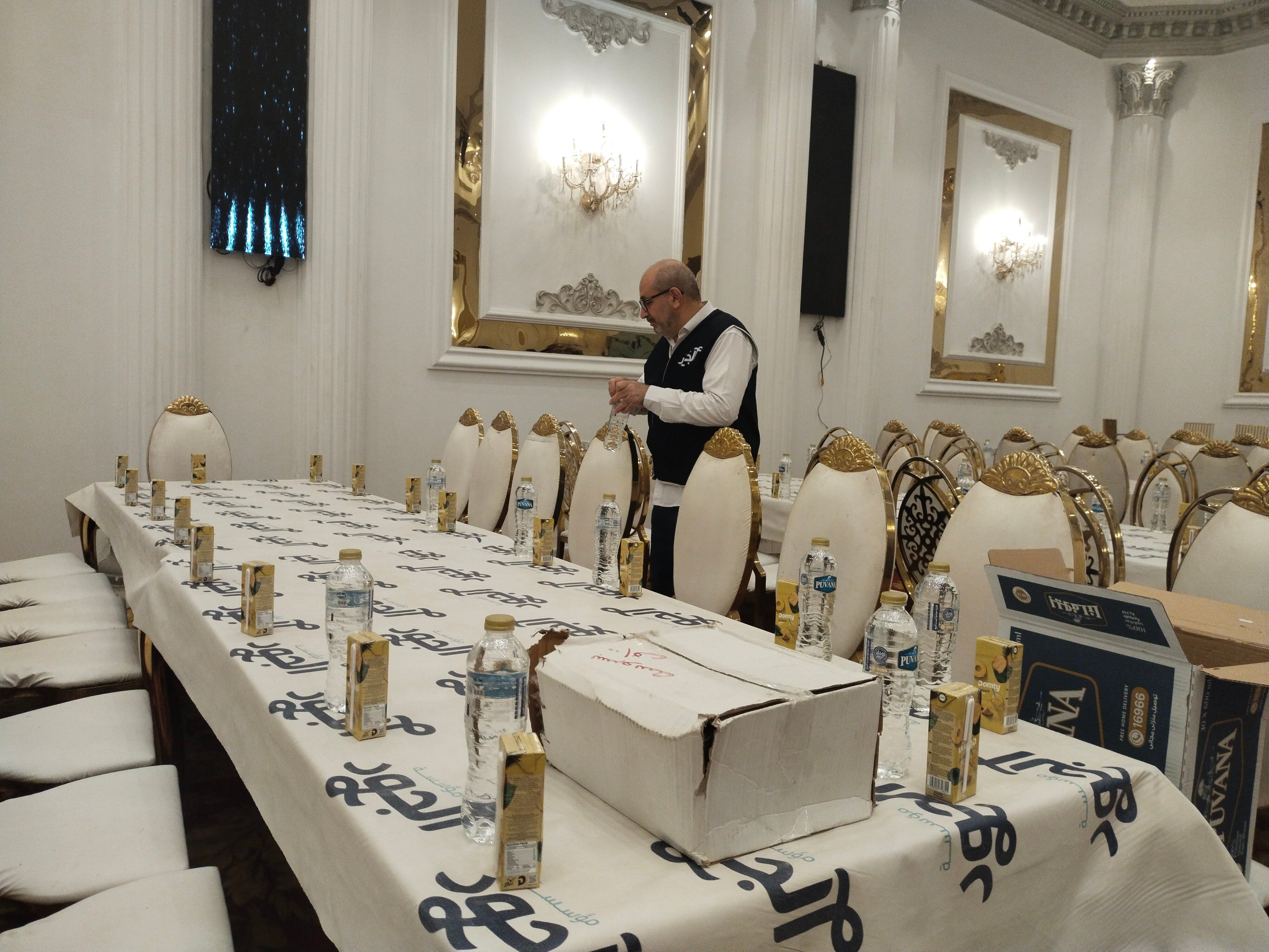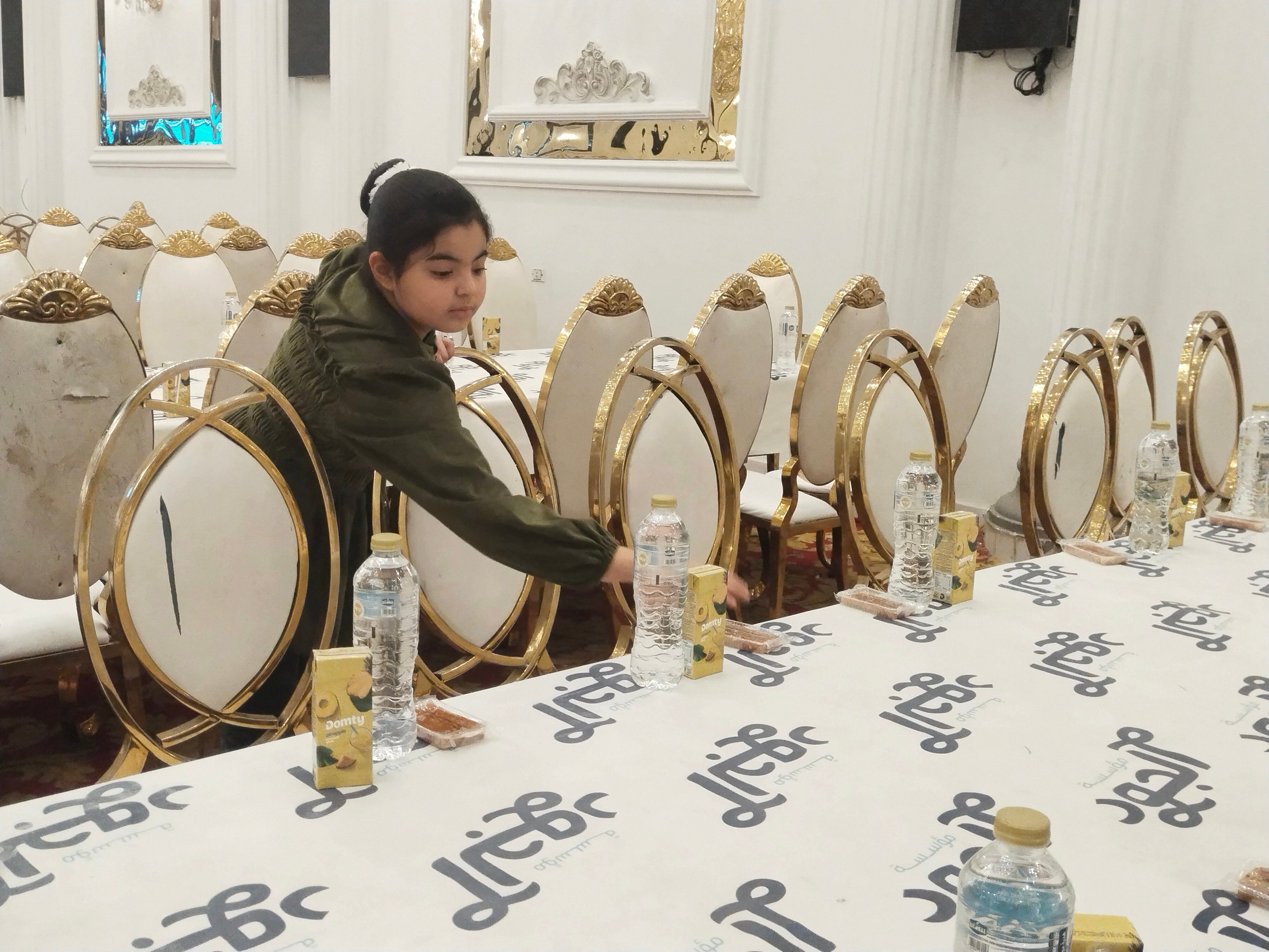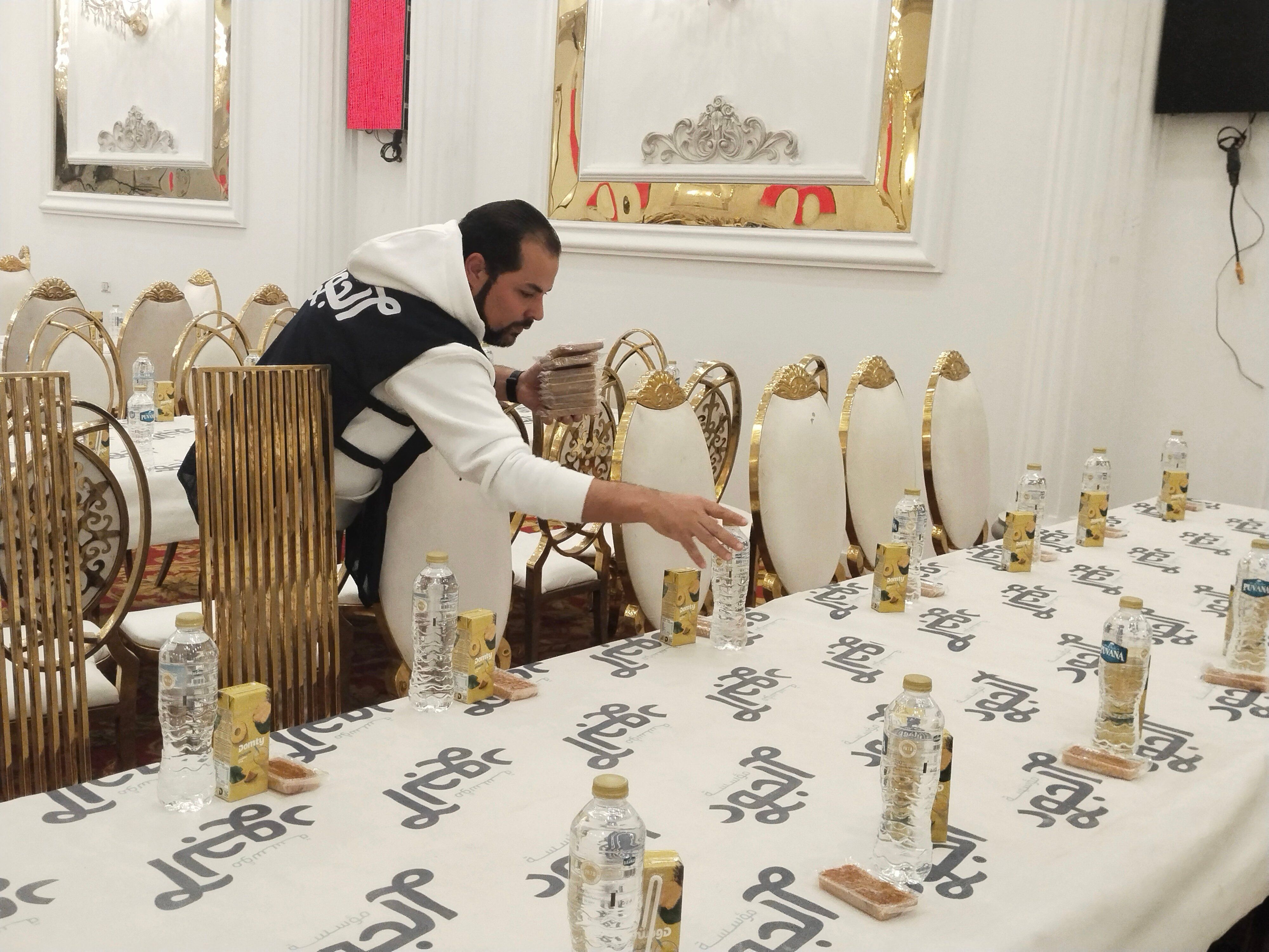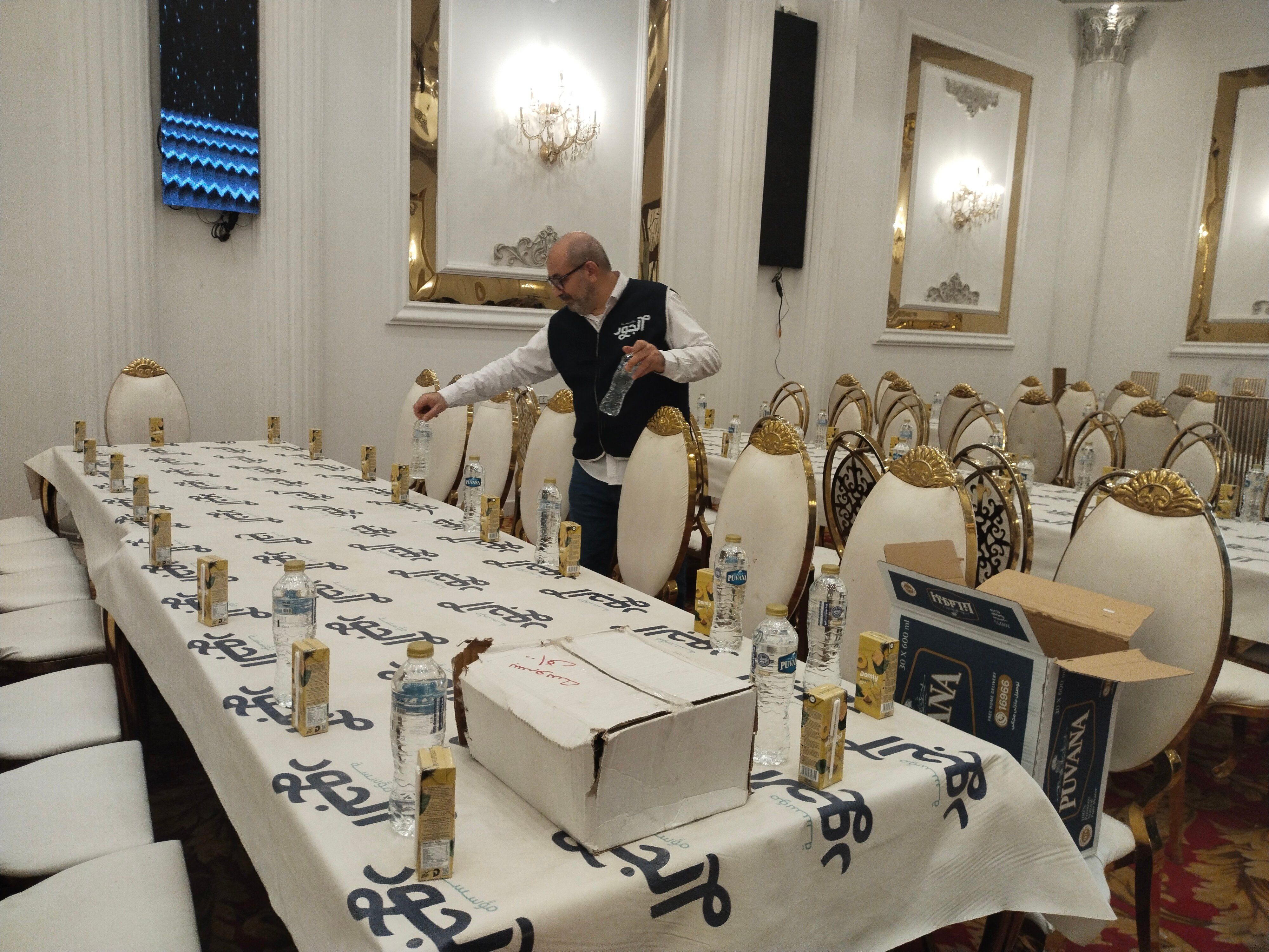 وبدأ المشاركين في أعمال التنظيم للفاعلية تجهيز المائدة المجمعة من خلال إعداد العصائر والمياه والحلويات قبل بدء تجهيز الوجبات الساخنة لكل المشاركين في الفاعلية.