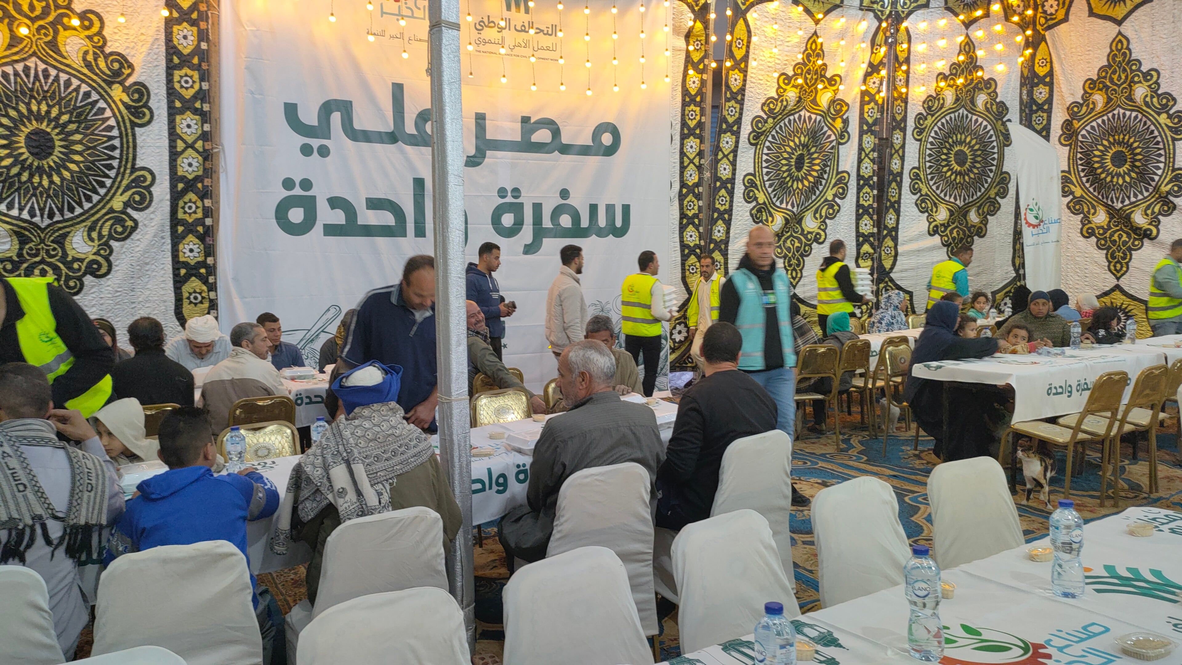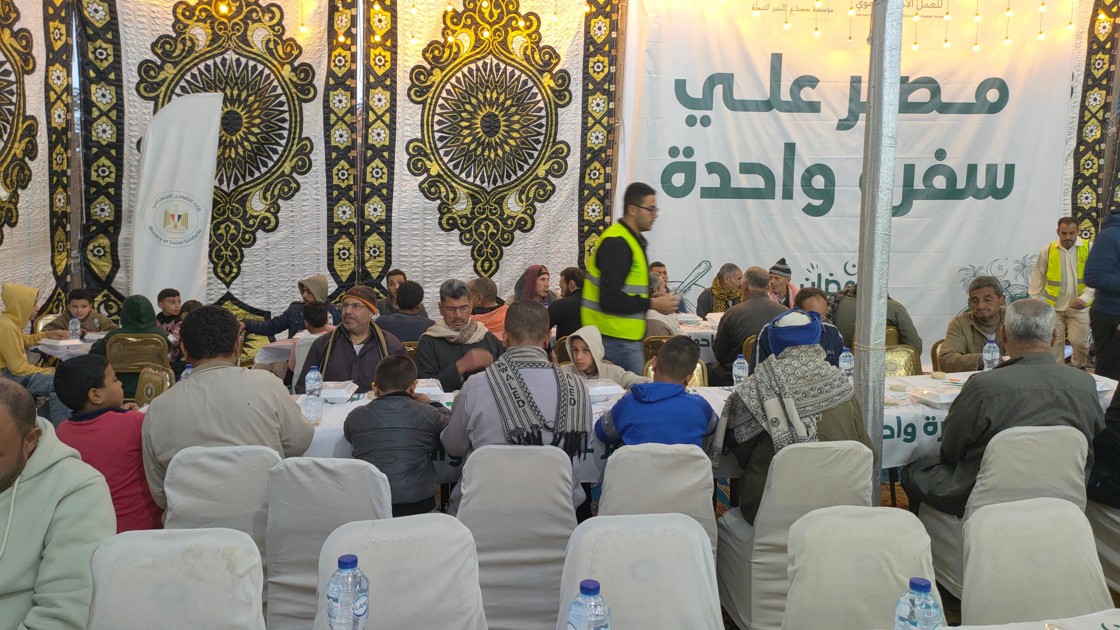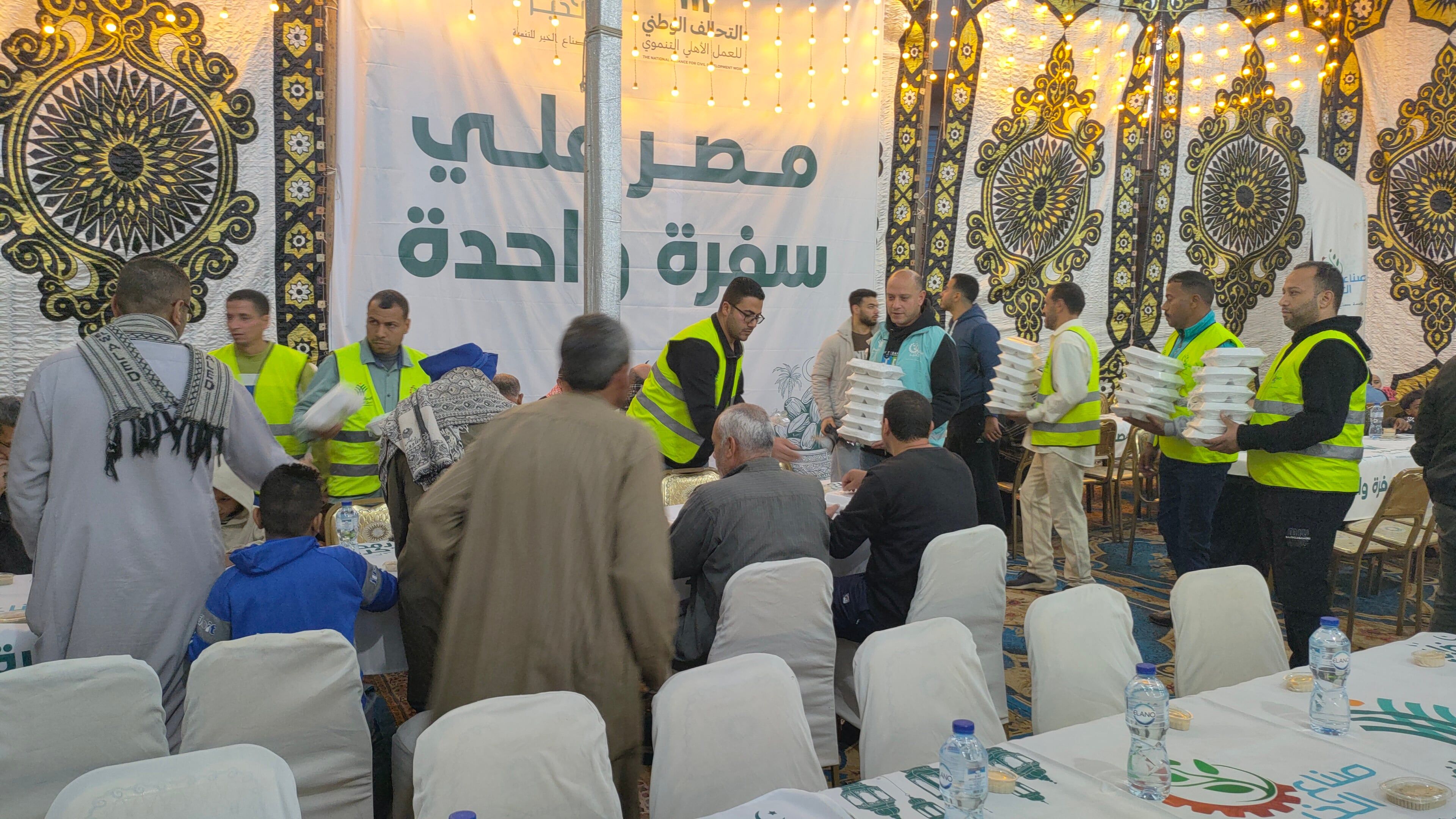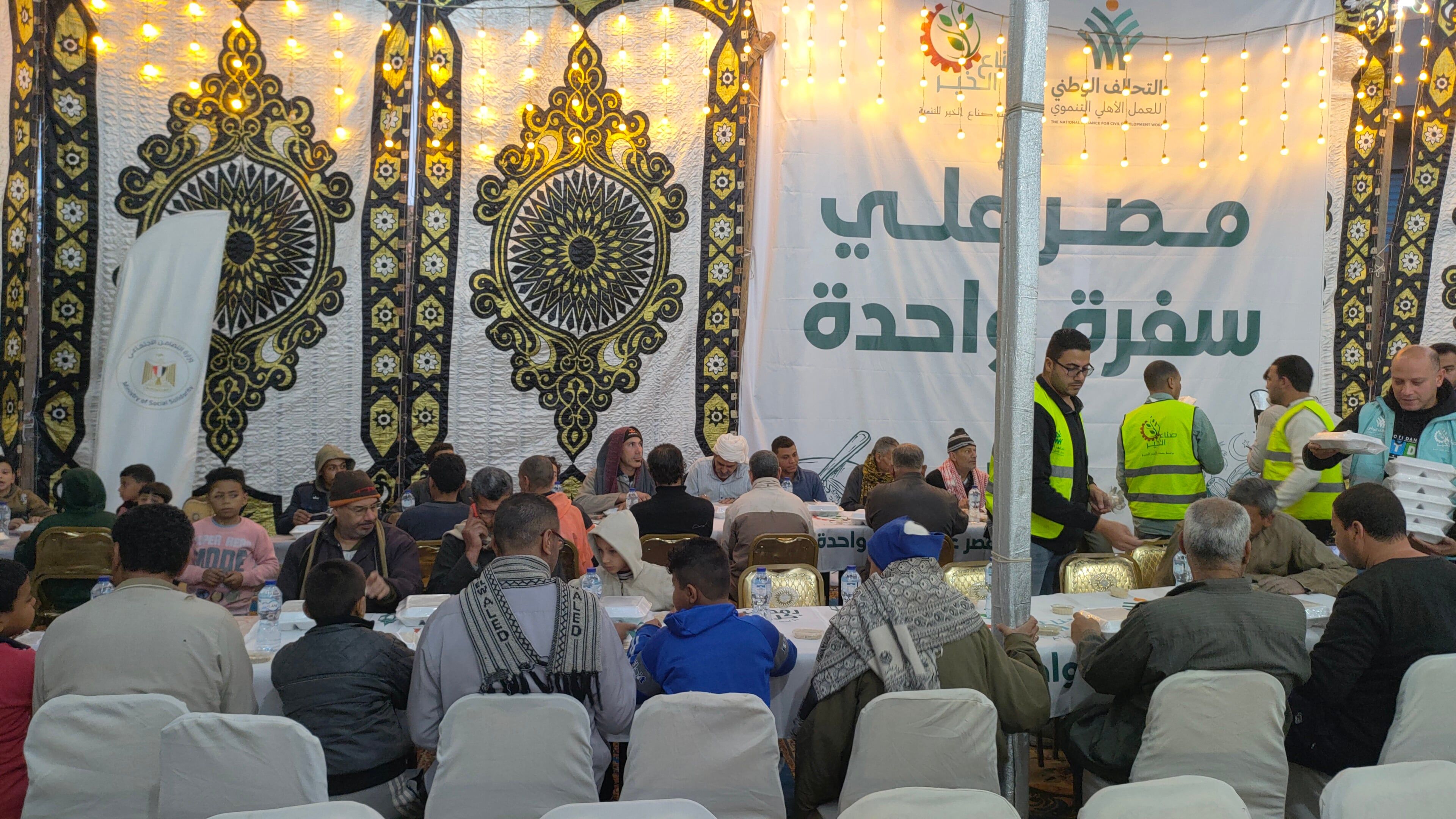تفاصيل حفل الإفطاروخلال الإفطار يجتمع الأهالي للإفطار علي سفرة واحدة في جو من الترابط والتآخى الاجتماعى خلال شهر رمضان المبارك، وأكد المنظمين أن هذه الفعالية لم تكن مجرد تقديم طعام، بل نموذجاً للعمل الاحترافي، حيث تخضع الوجبات لإشراف دقيق لضمان سلامة الغذاء، وتشمل مكونات غذائية متكاملة تشمل البروتين والنشويات والعصائر الطازجة والتمور.