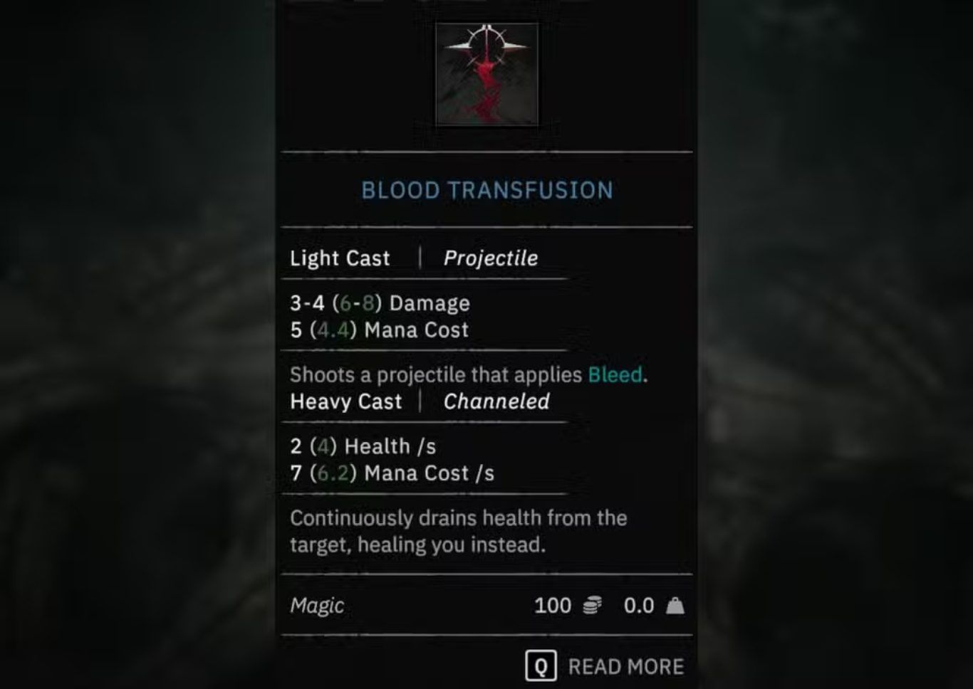 تعد تعويذة Blood Transfusion واحدة من التعويذات المفيدة في المراحل المبكرة من لعبة Tainted Grail The Fall of Avalon حيث تمنح اللاعبين وسيلة فعالة لإضعاف الأعداء وإلحاق ضرر متزايد بهم مع مرور الوقت. تعتمد هذه التعويذة على التحكم في طاقة الدم داخل المعركة وتوفر طريقتين مختلفتين للاستخدام لكل منهما تأثير خاص يمكن استغلاله أثناء المواجهات مع الأعداء.
