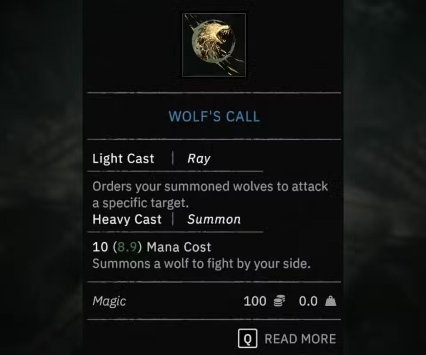 عند استخدام التعويذة عبر Light Cast لا يتم استدعاء ذئب جديد بل يتم إصدار أمر مباشر للذئاب المستدعاة بالفعل لمهاجمة هدف محدد. يسمح هذا الاستخدام للاعب بتوجيه الذئب نحو خصم معين داخل المعركة وهو ما يجعل السيطرة على سير القتال أكثر دقة خاصة عند مواجهة عدو قوي يحتاج إلى تركيز الهجمات عليه.